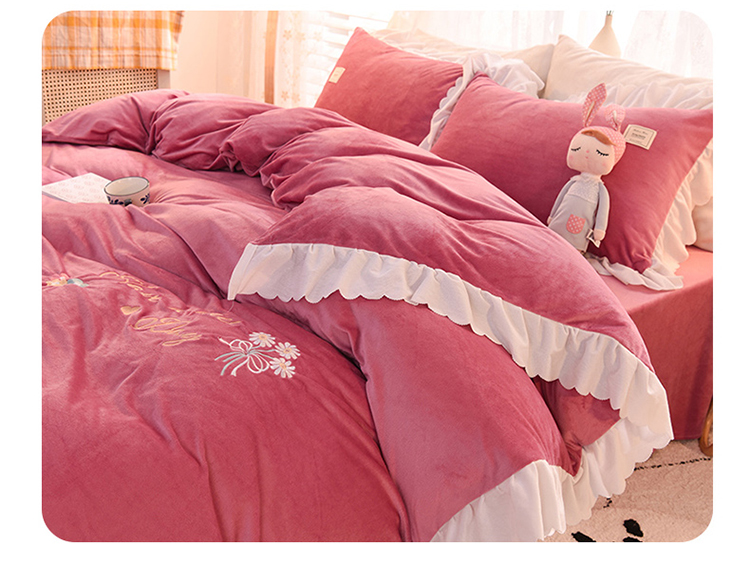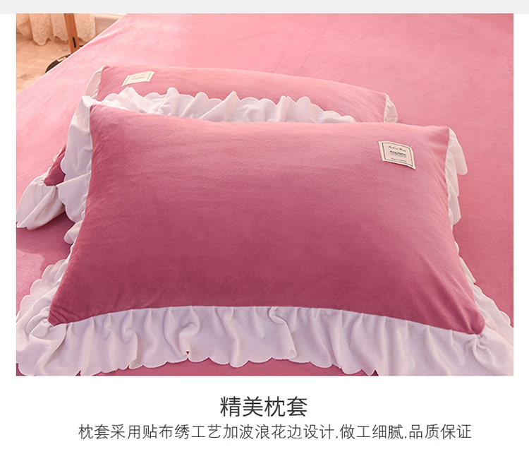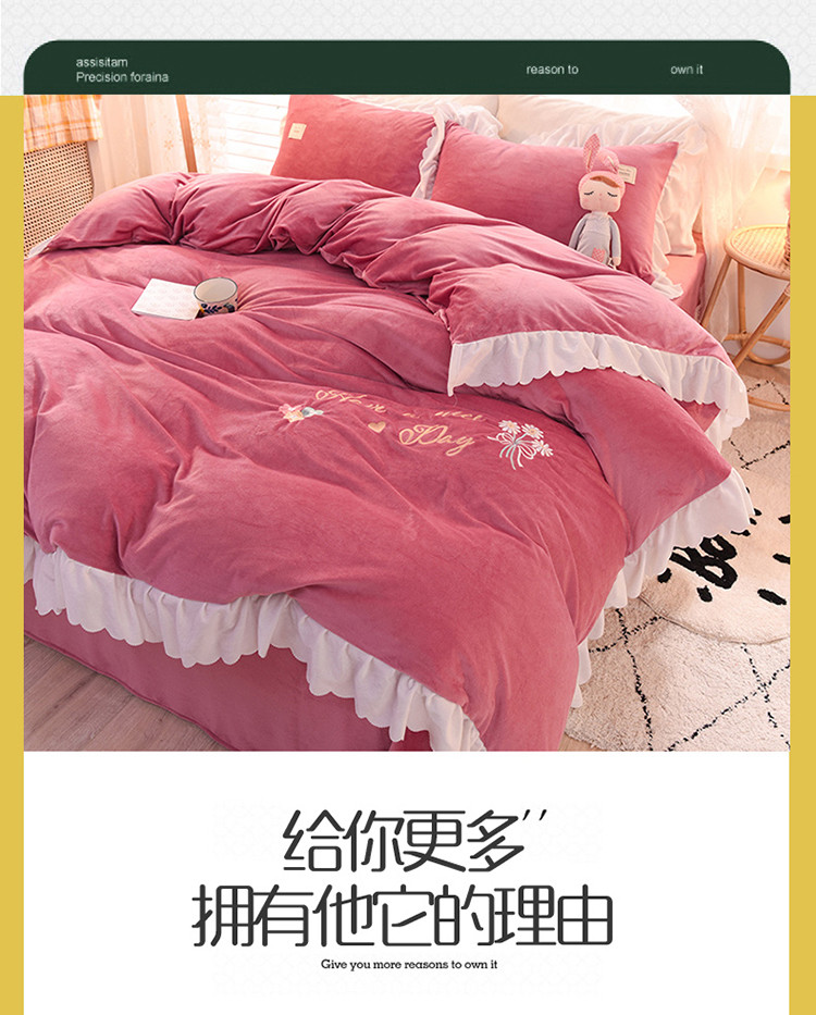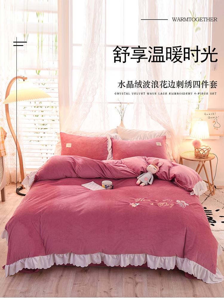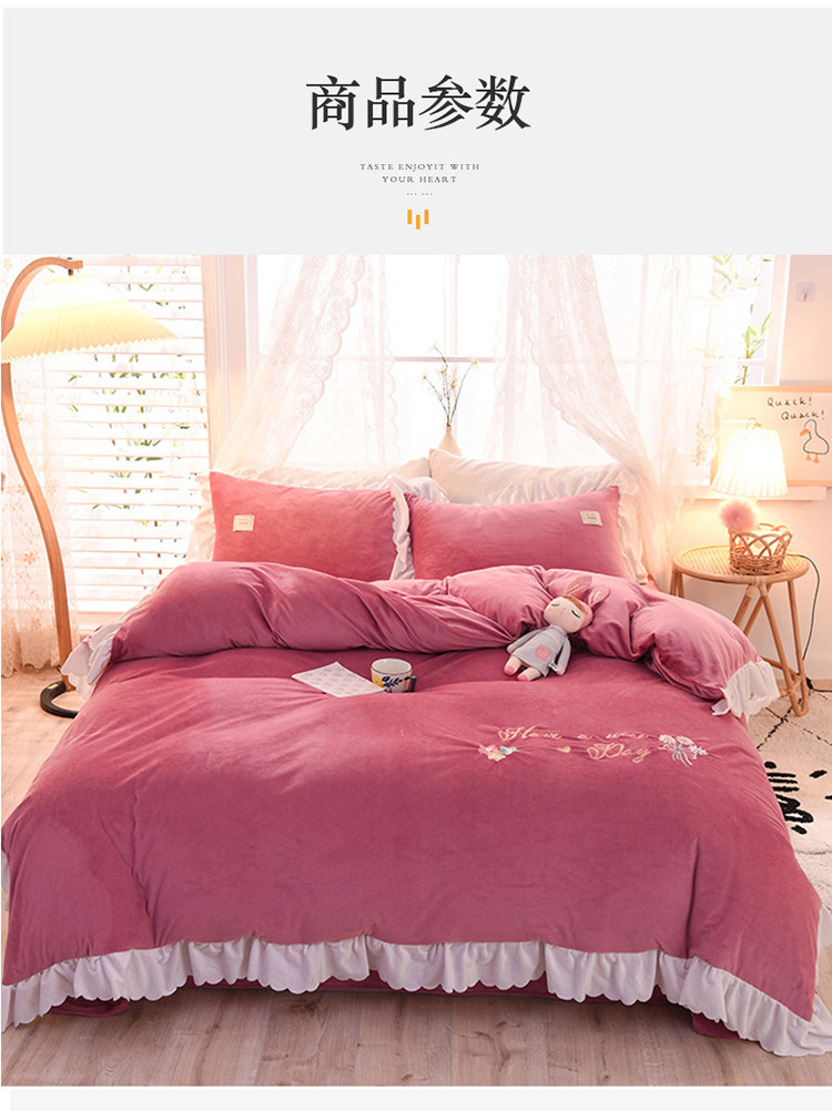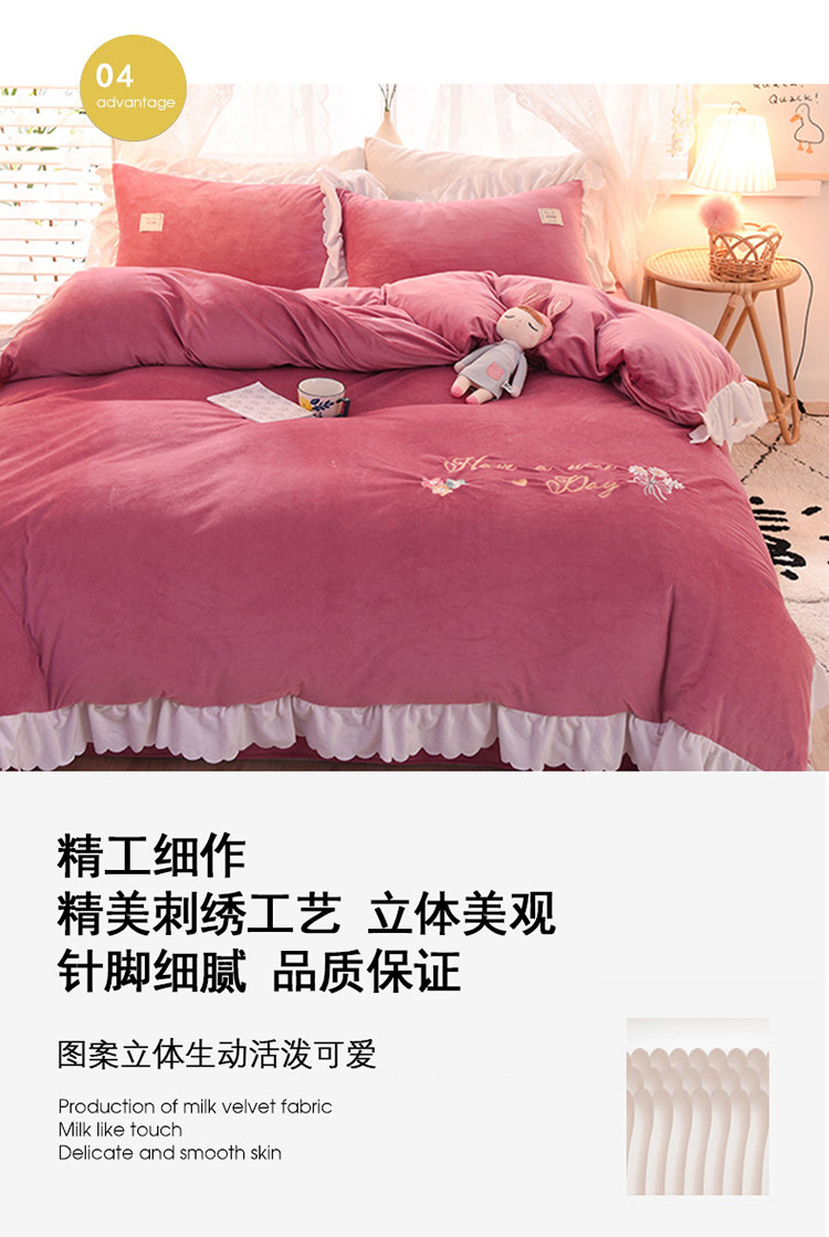 (总)艾米家居 2025秋冬新款浮雕牛奶绒花边四件套,白色,豆沙,粉色