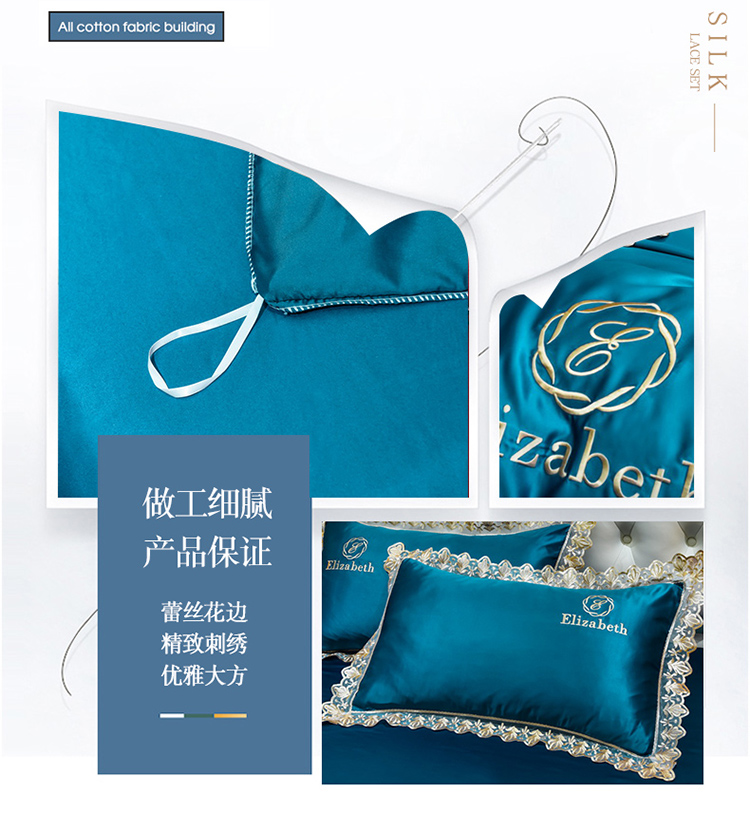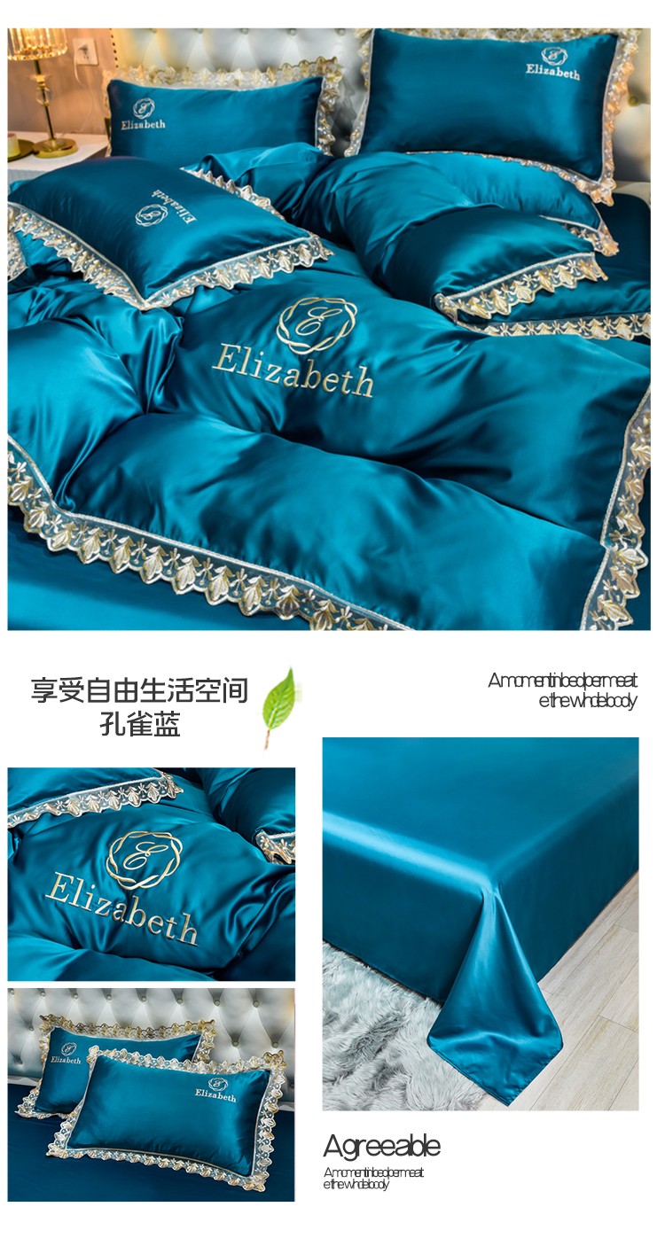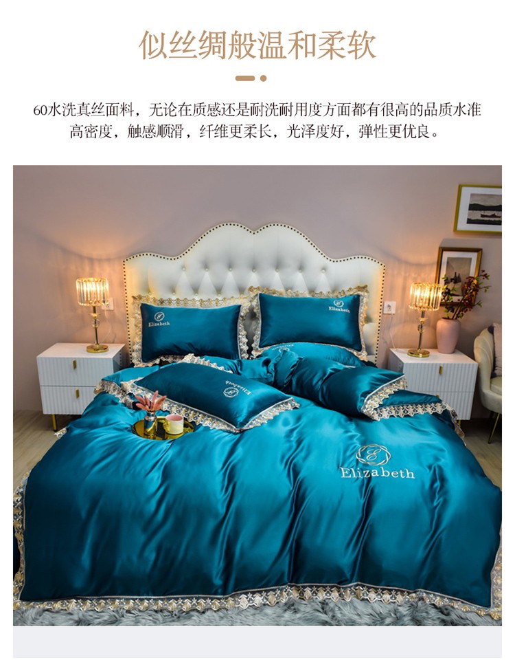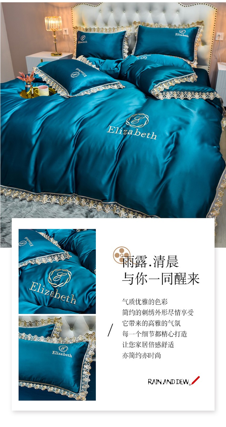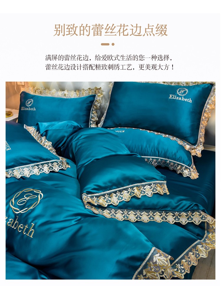 米奈家居 2021新款水洗真丝蕾丝花边爱琳四件套 孔雀蓝
