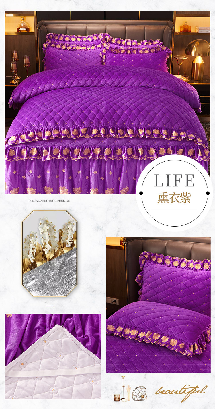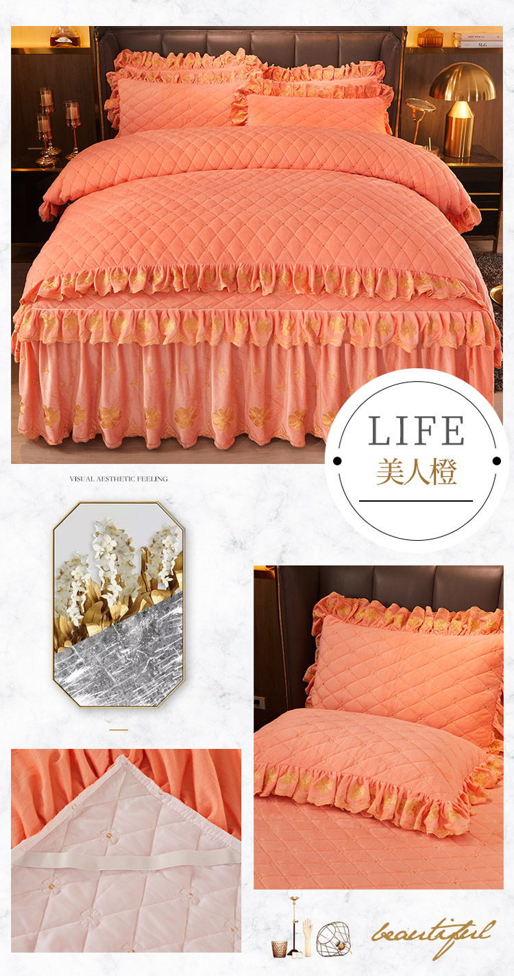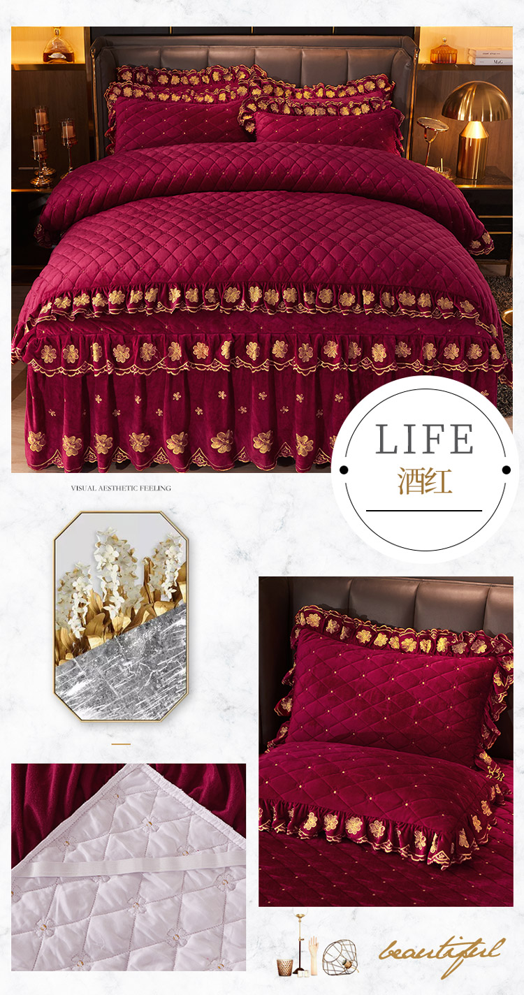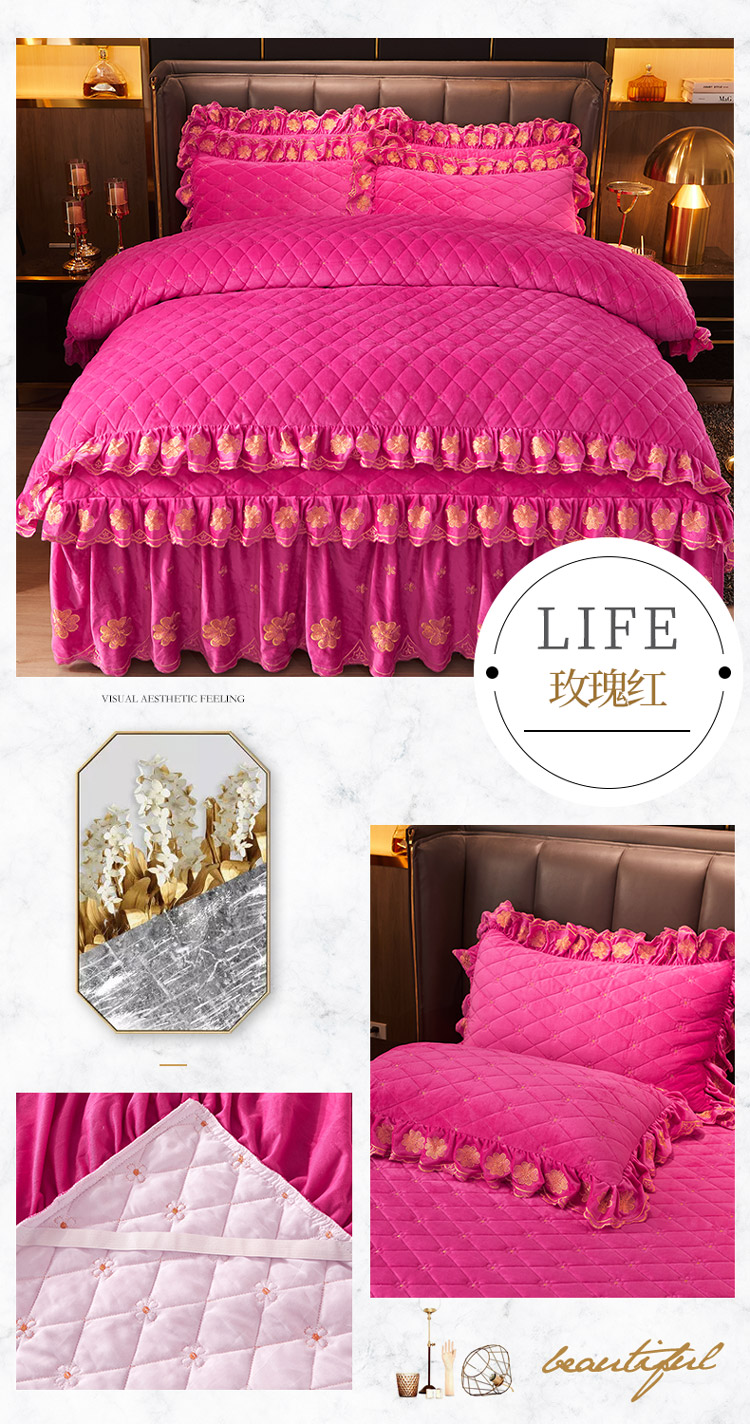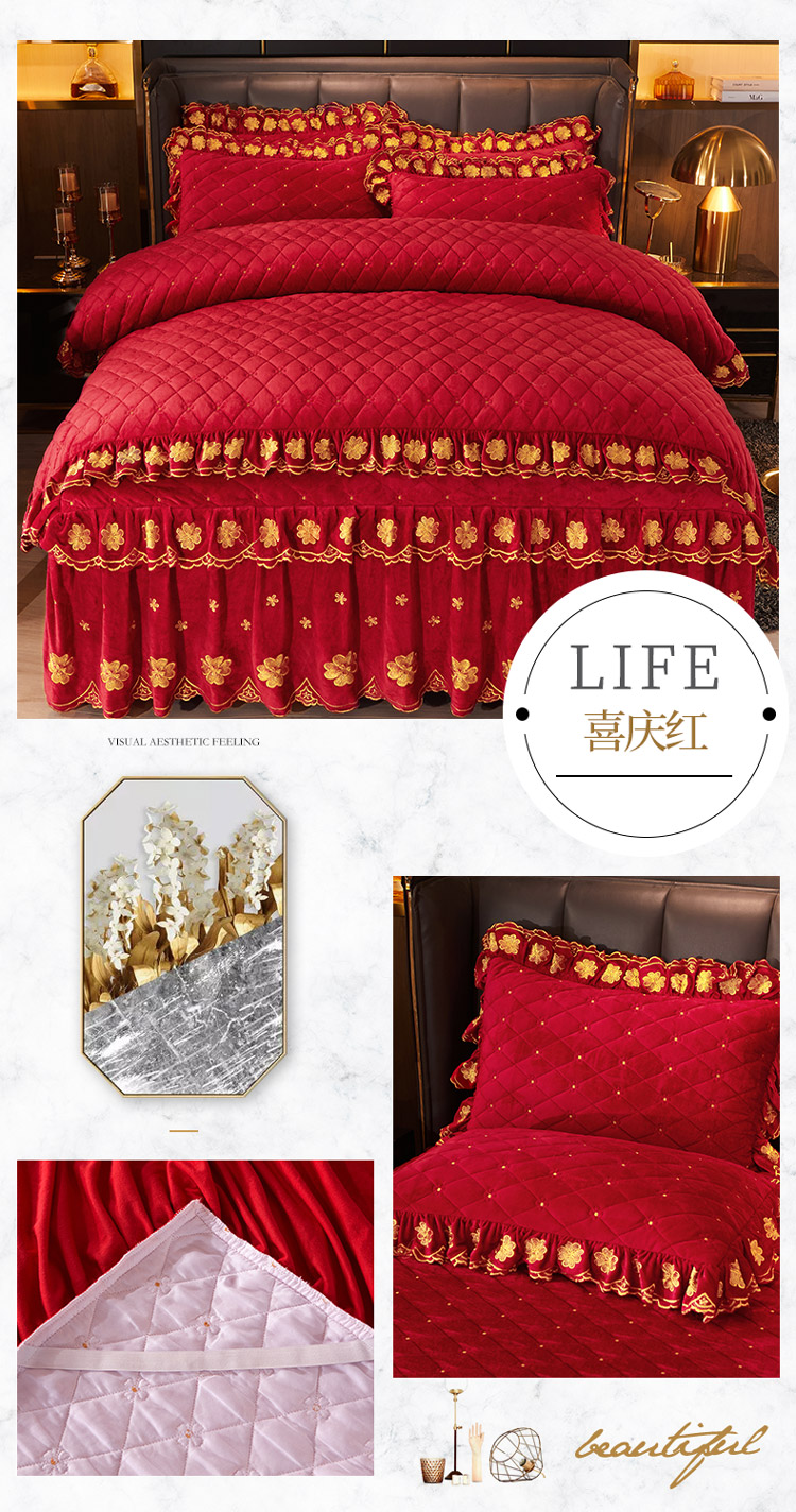 (总)恒爱 2022秋冬水晶绒翩翩花舞夹棉床裙四件套,大红色,豆沙红,橄榄绿,公主粉,桔色,咖啡色,孔雀绿,拉菲红,罗兰紫,玫红色,美人玉,米白色,米驼色,抹茶绿,浅灰色,紫色