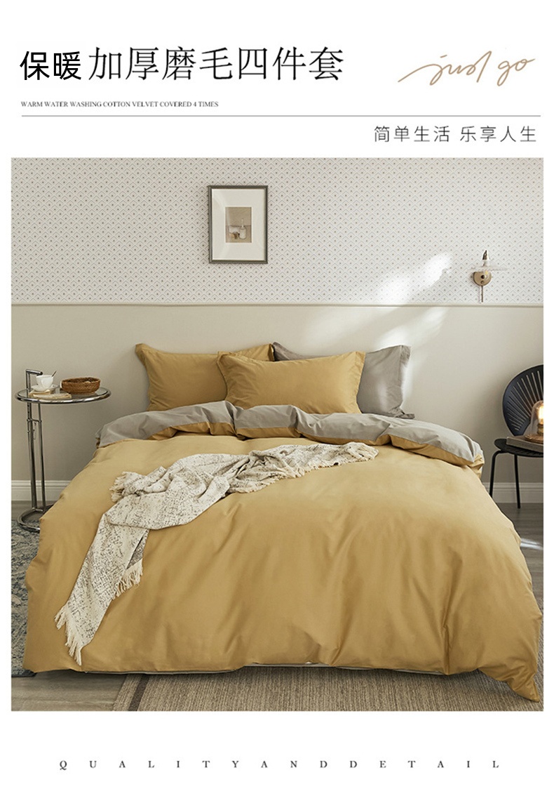 当前位置: 91家纺网 > 商品网购 > 床品套件 > 四件套 > 普通磨毛四件套 > 2021新款加厚磨毛四件套玉子黄灰