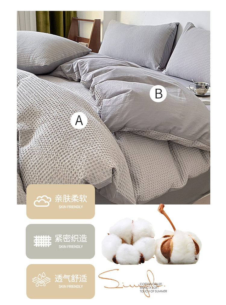 商品名称:雅居纺家纺 2022新款全棉华夫格普通款四件套 月灰