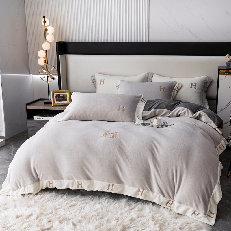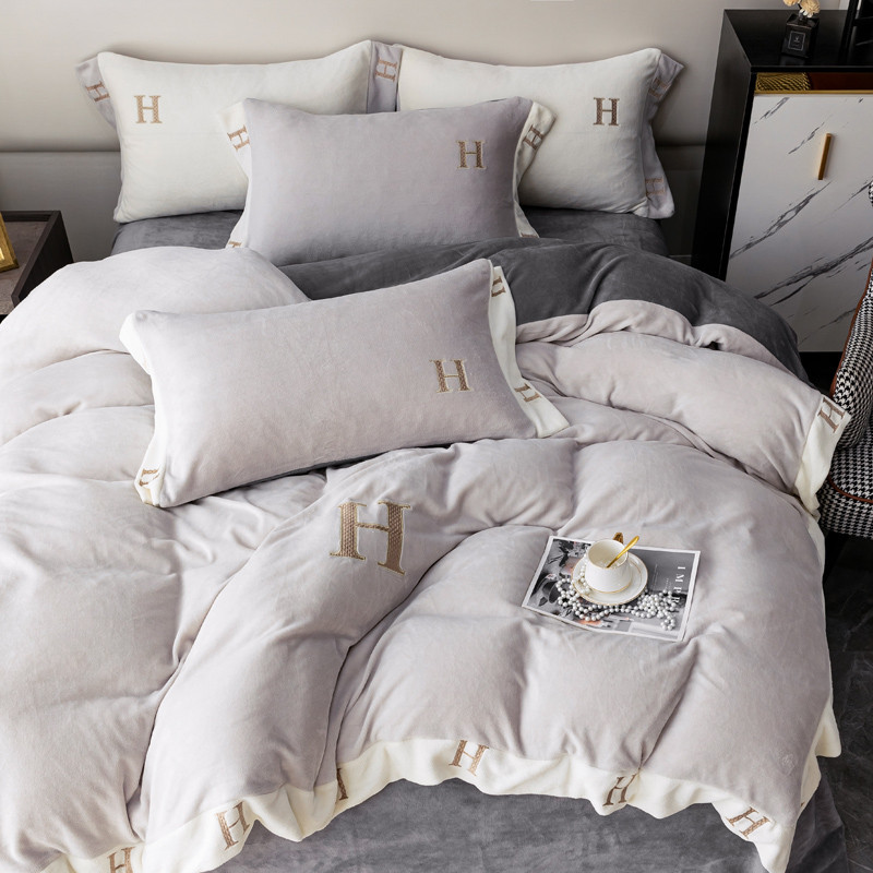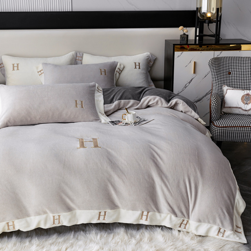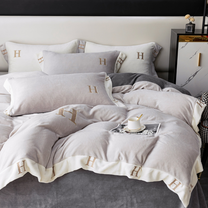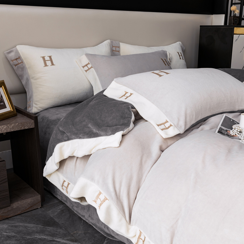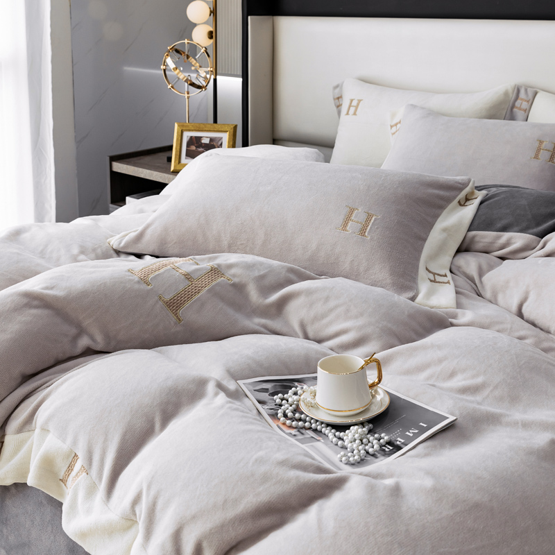 芯贝儿22新款小清新加厚牛奶绒宝宝绒绣花四件套 慕斯灰