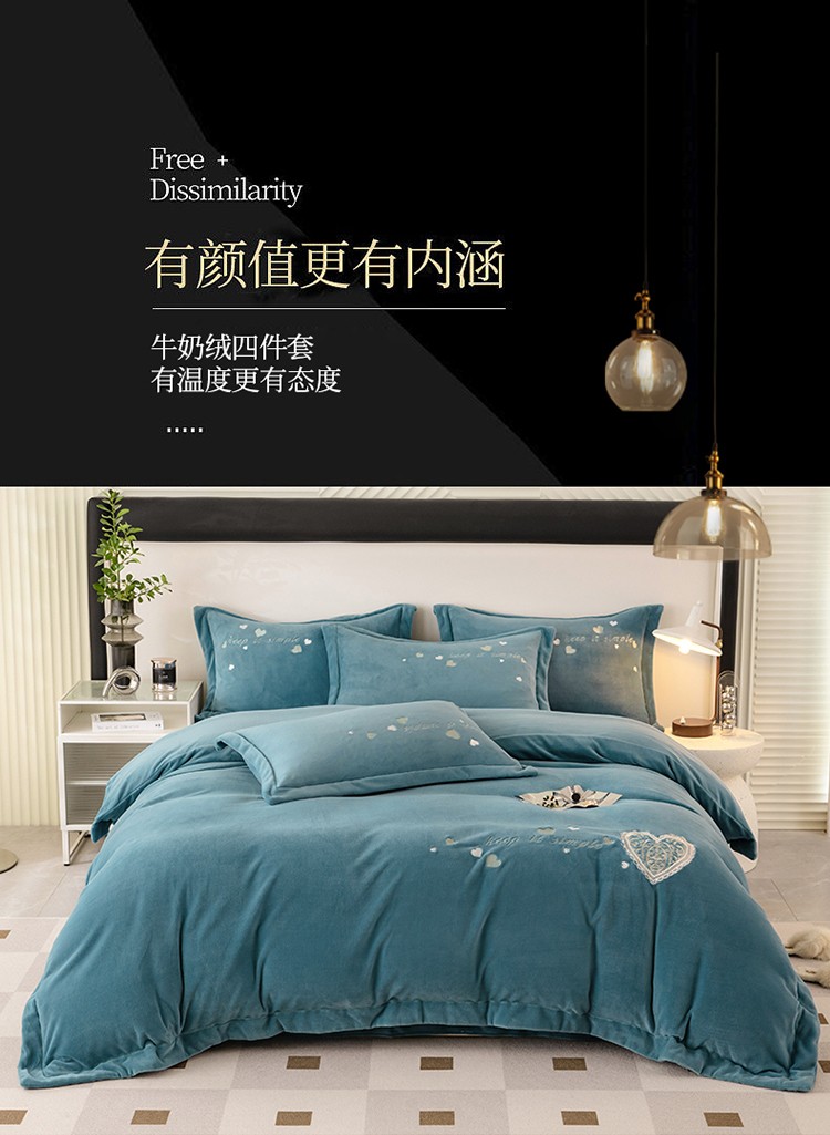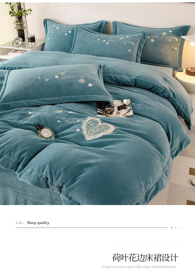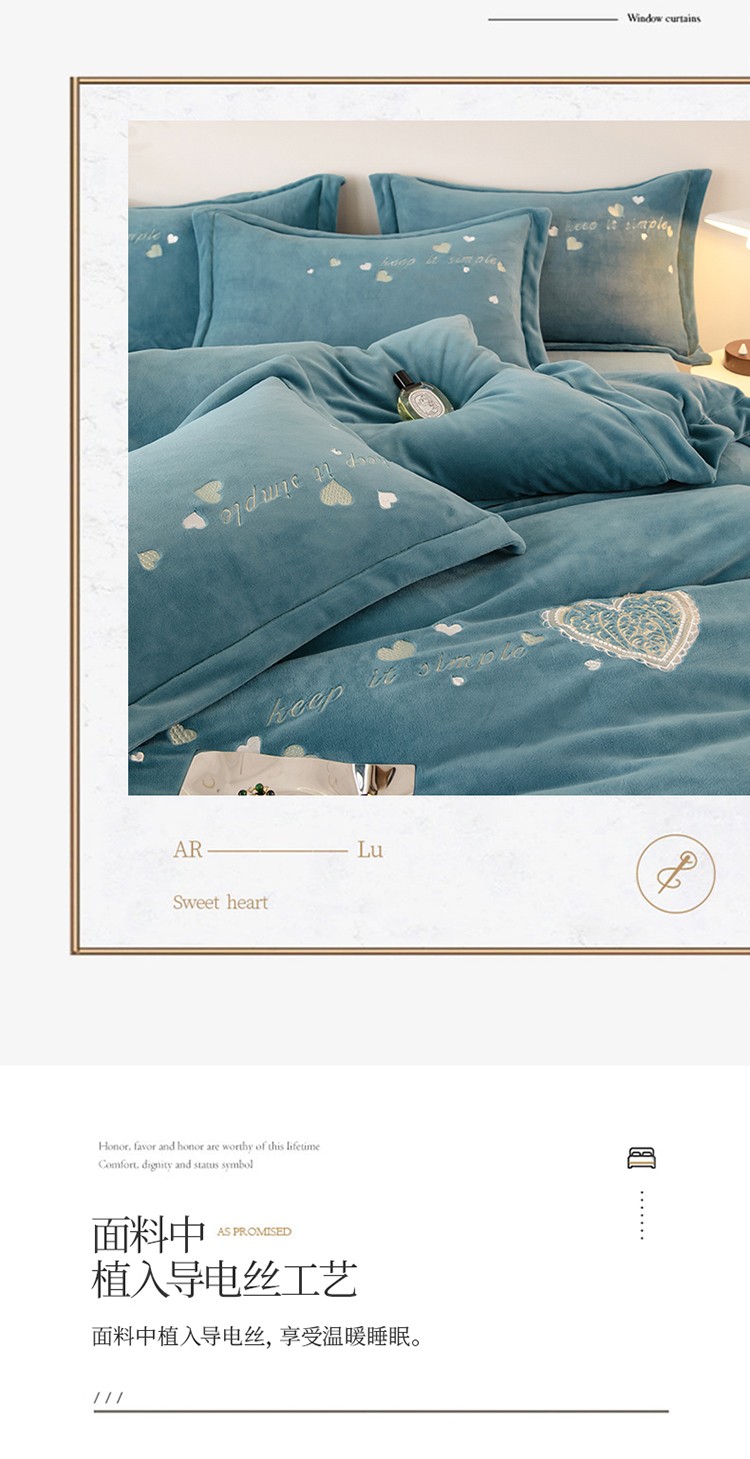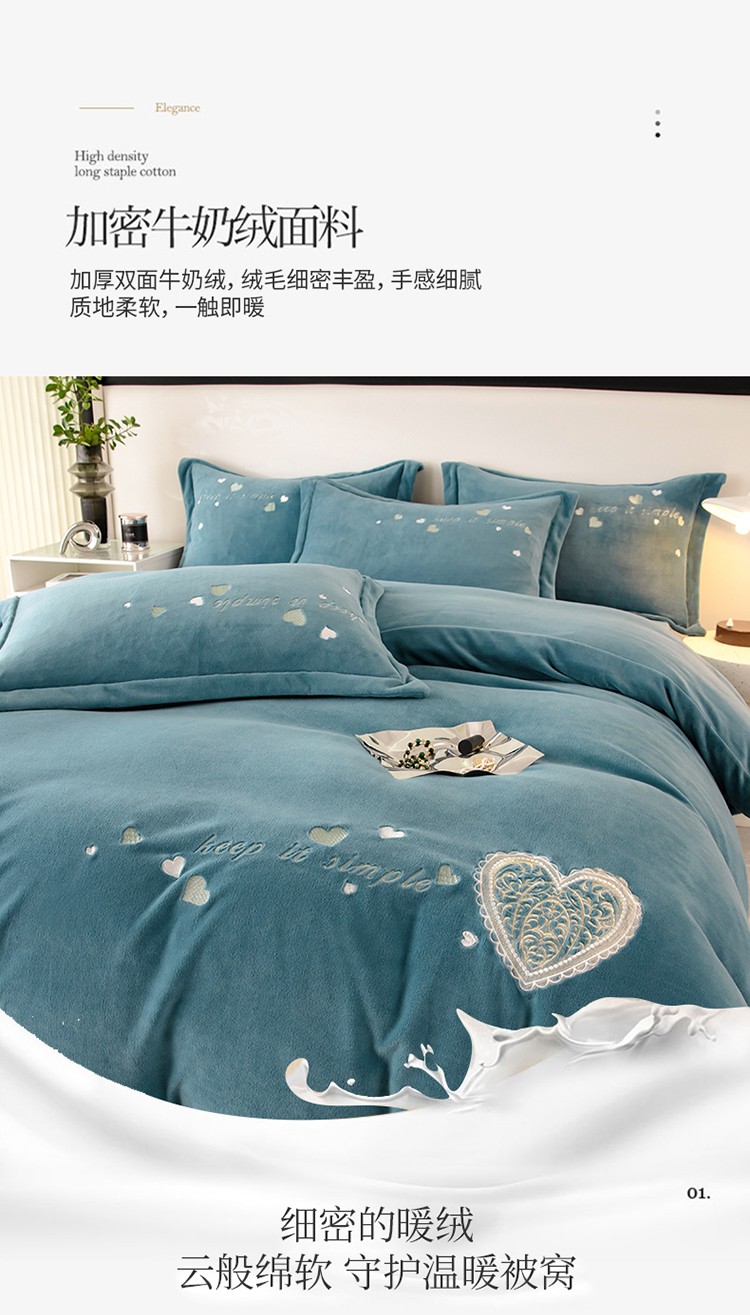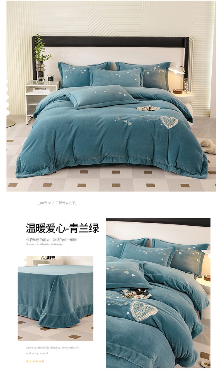 绒博士新款牛奶绒刺绣压线款四件套-温暖爱心 温暖爱心-青兰绿