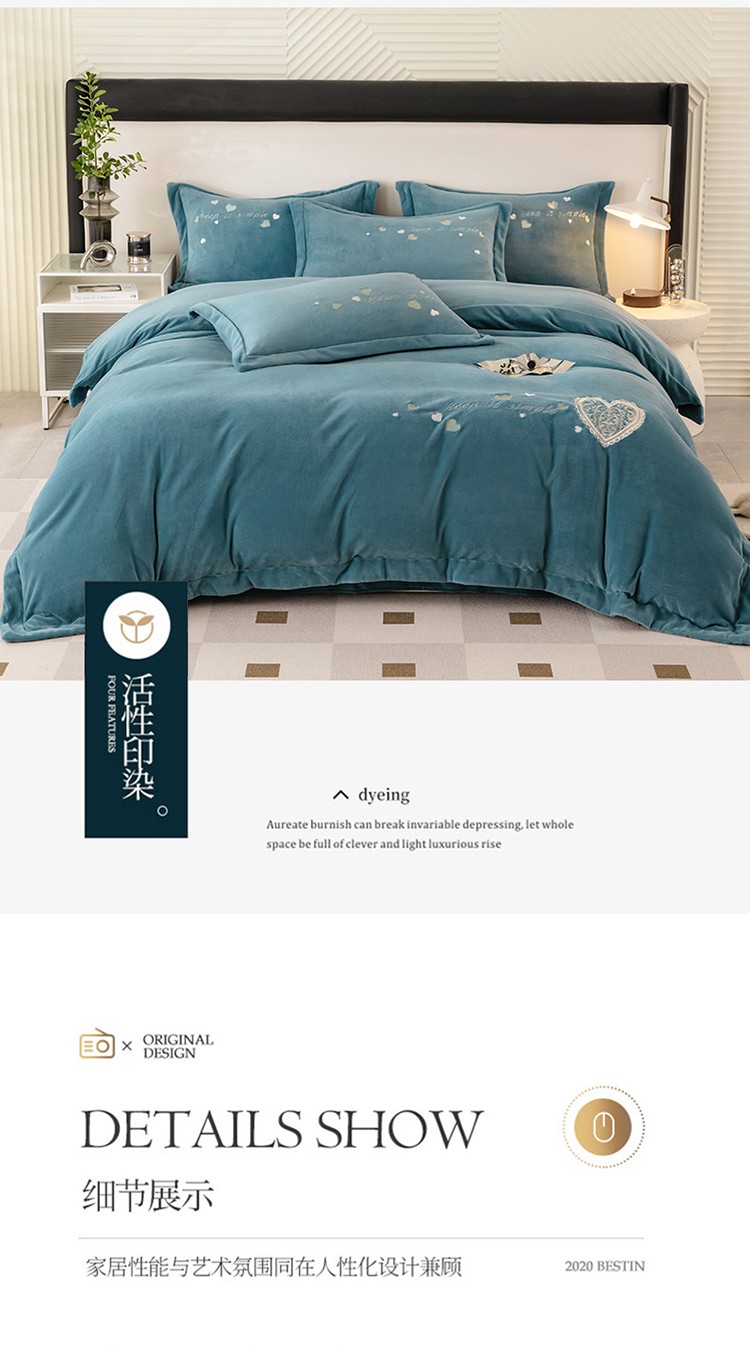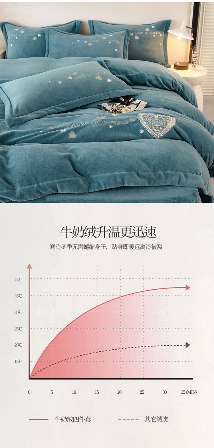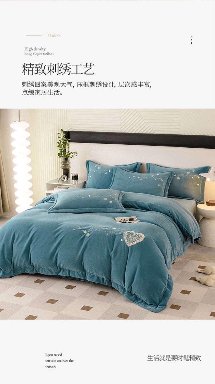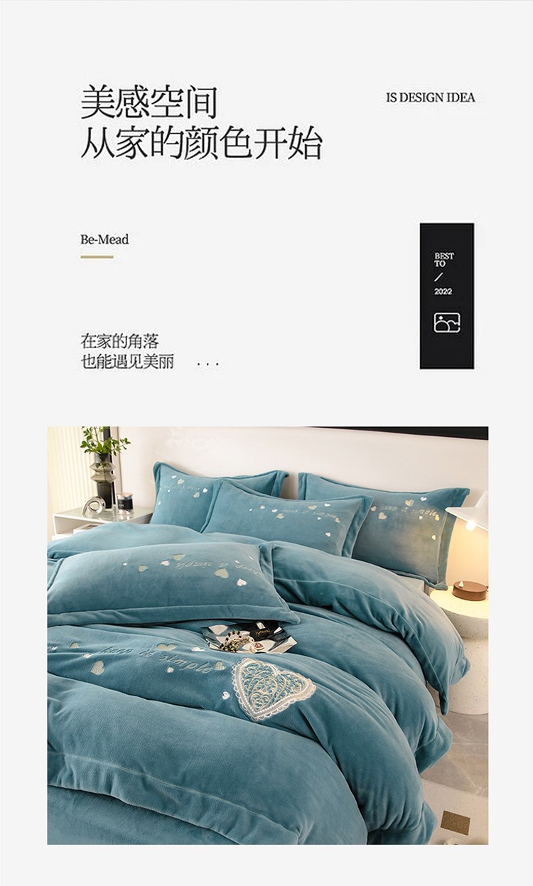 绒博士新款牛奶绒刺绣压线款四件套-温暖爱心 温暖爱心-青兰绿