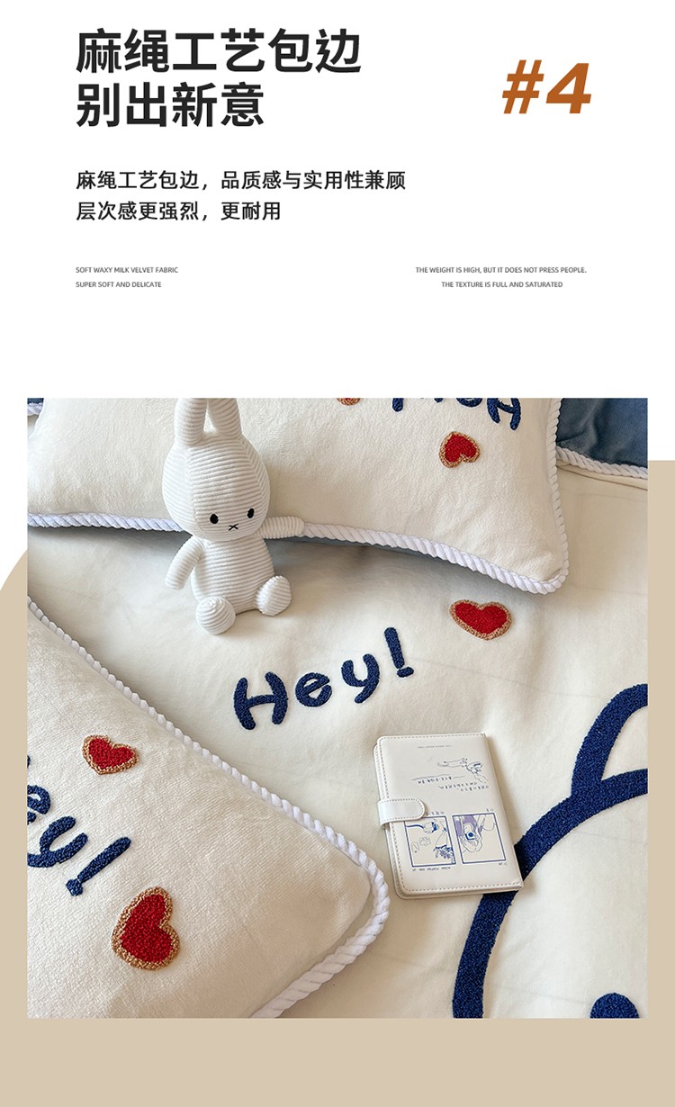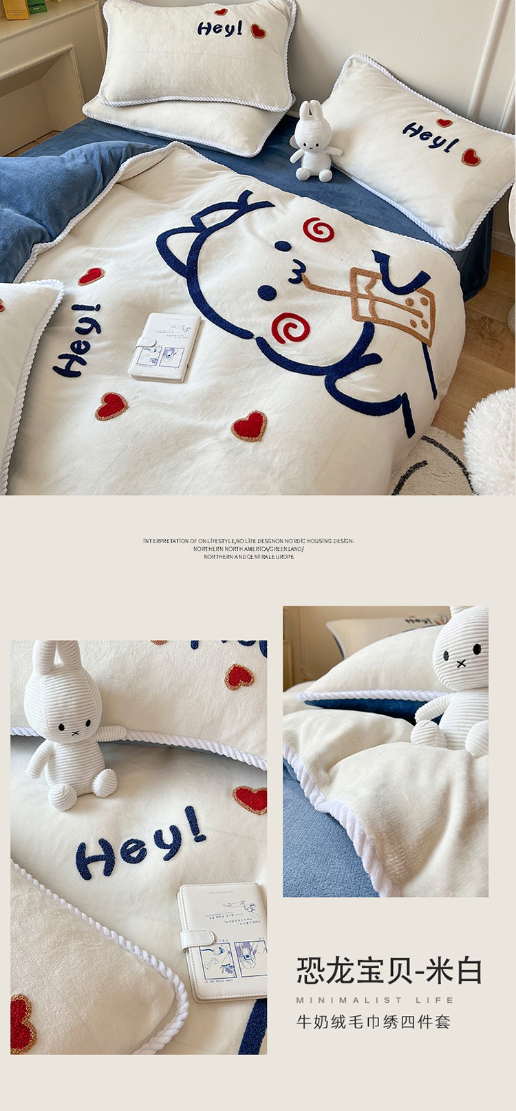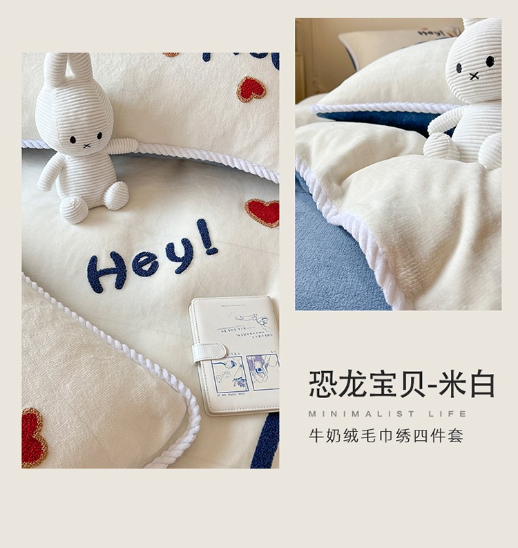 芯贝儿 新款加厚保暖雕花牛奶绒毛巾绣花宝宝法莱绒四件套 恐龙宝贝-米白