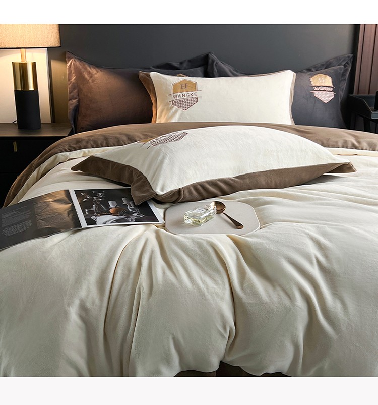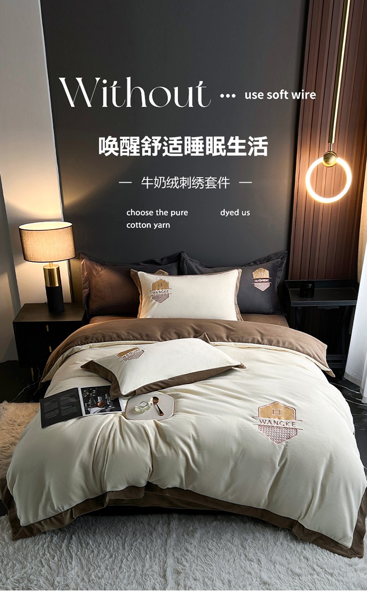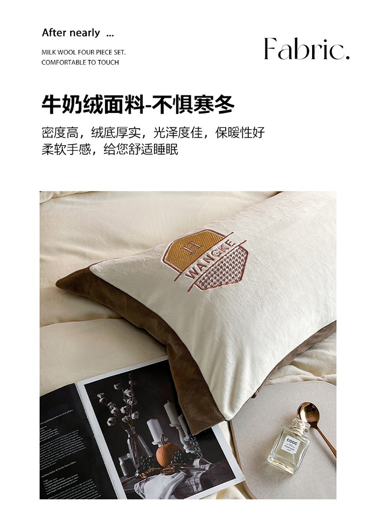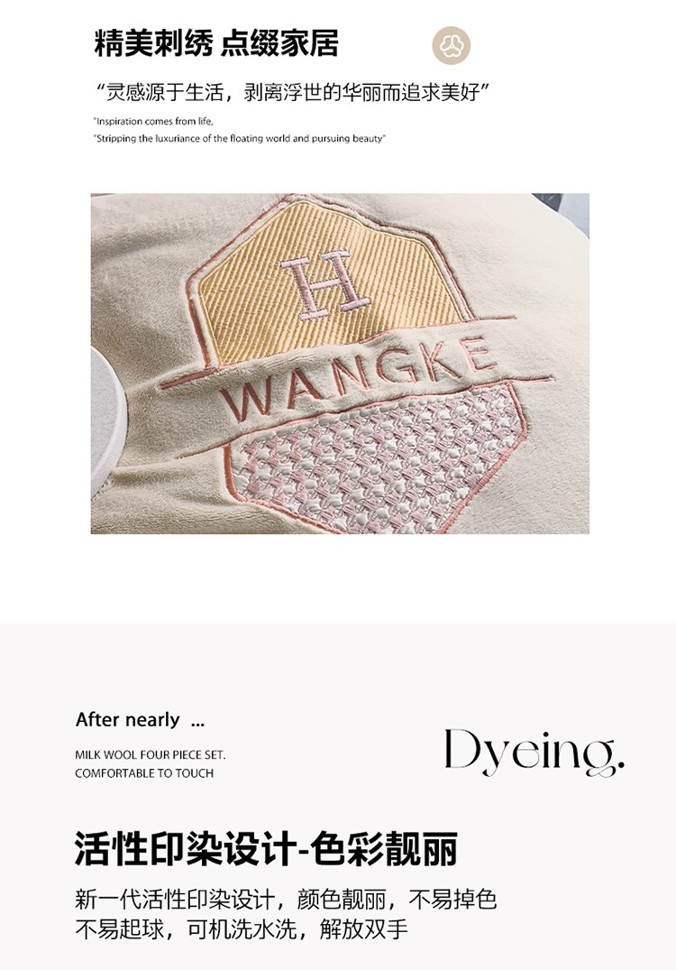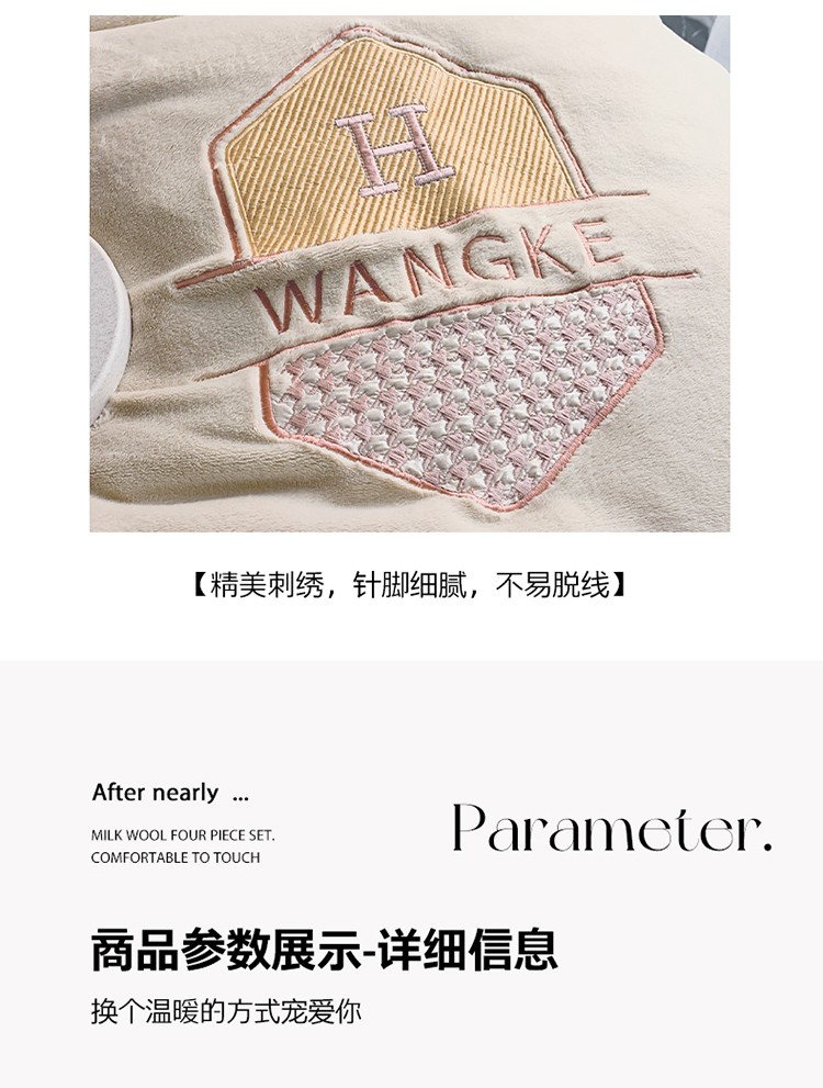 当前位置: 91家纺网 > 商品网购 > 床品套件 > 四件套 > 牛奶绒四件套 > 网客 2024新款牛奶绒四件套拼色绣花系列 奶白