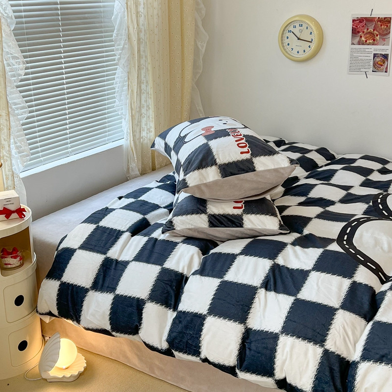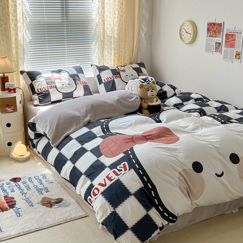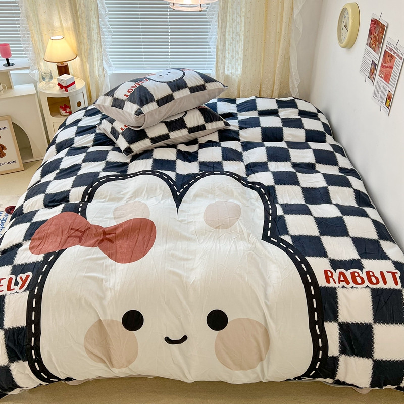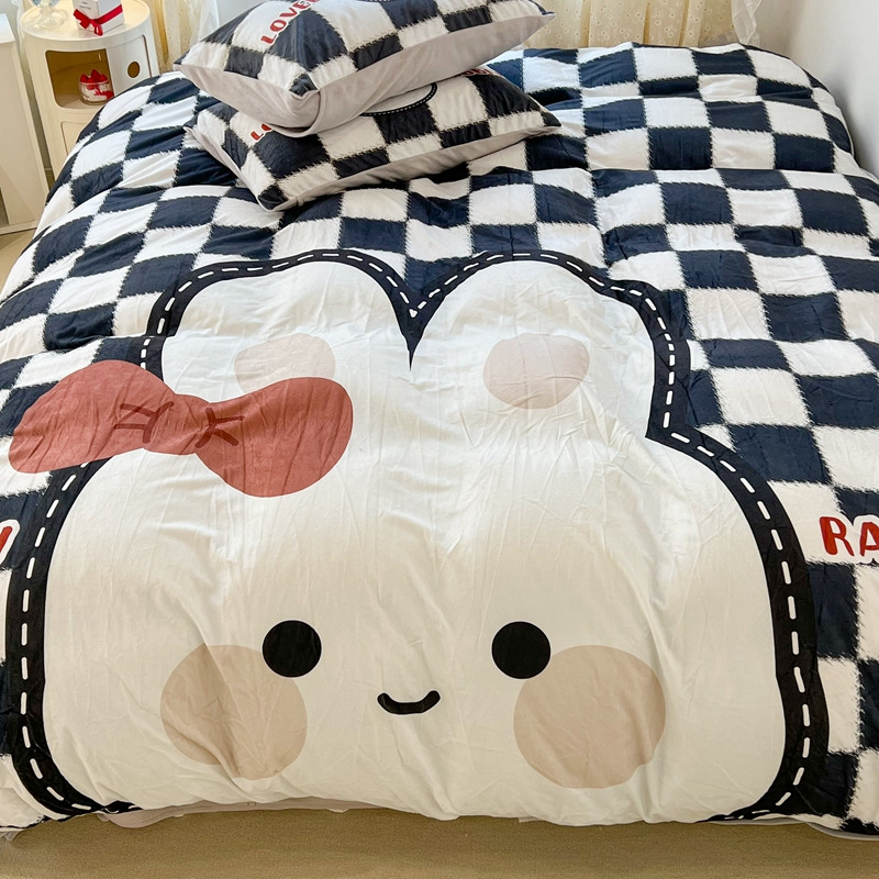 昔可 2022新款大版数码印花牛奶绒四件套 黑棋盘兔