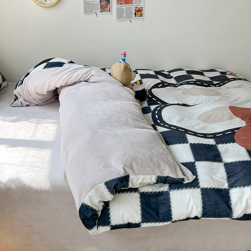 商品名称:昔可 2022新款大版数码印花牛奶绒四件套 黑棋盘兔