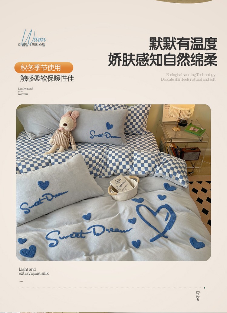 三朵2022新款牛奶绒绣花四件套 心情-粉蓝