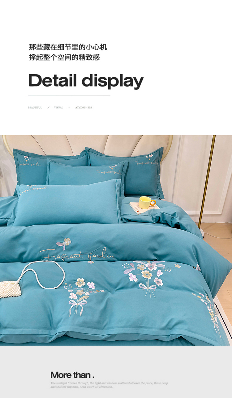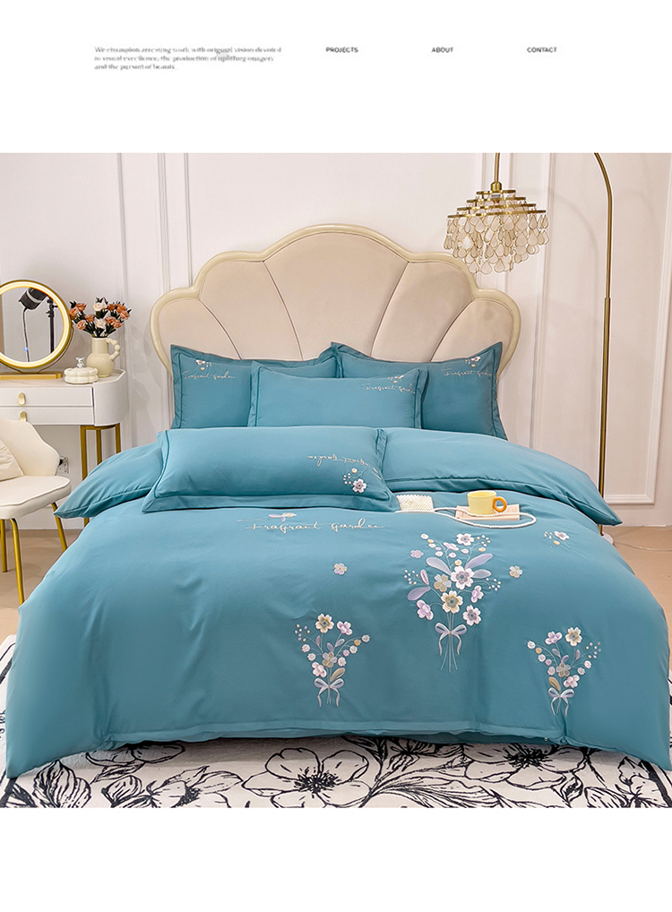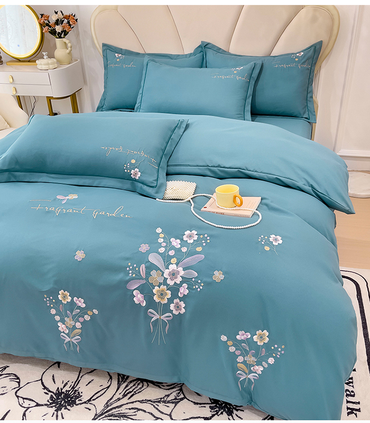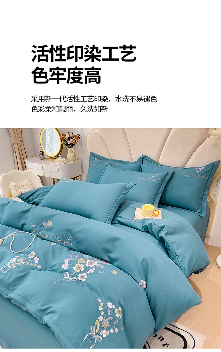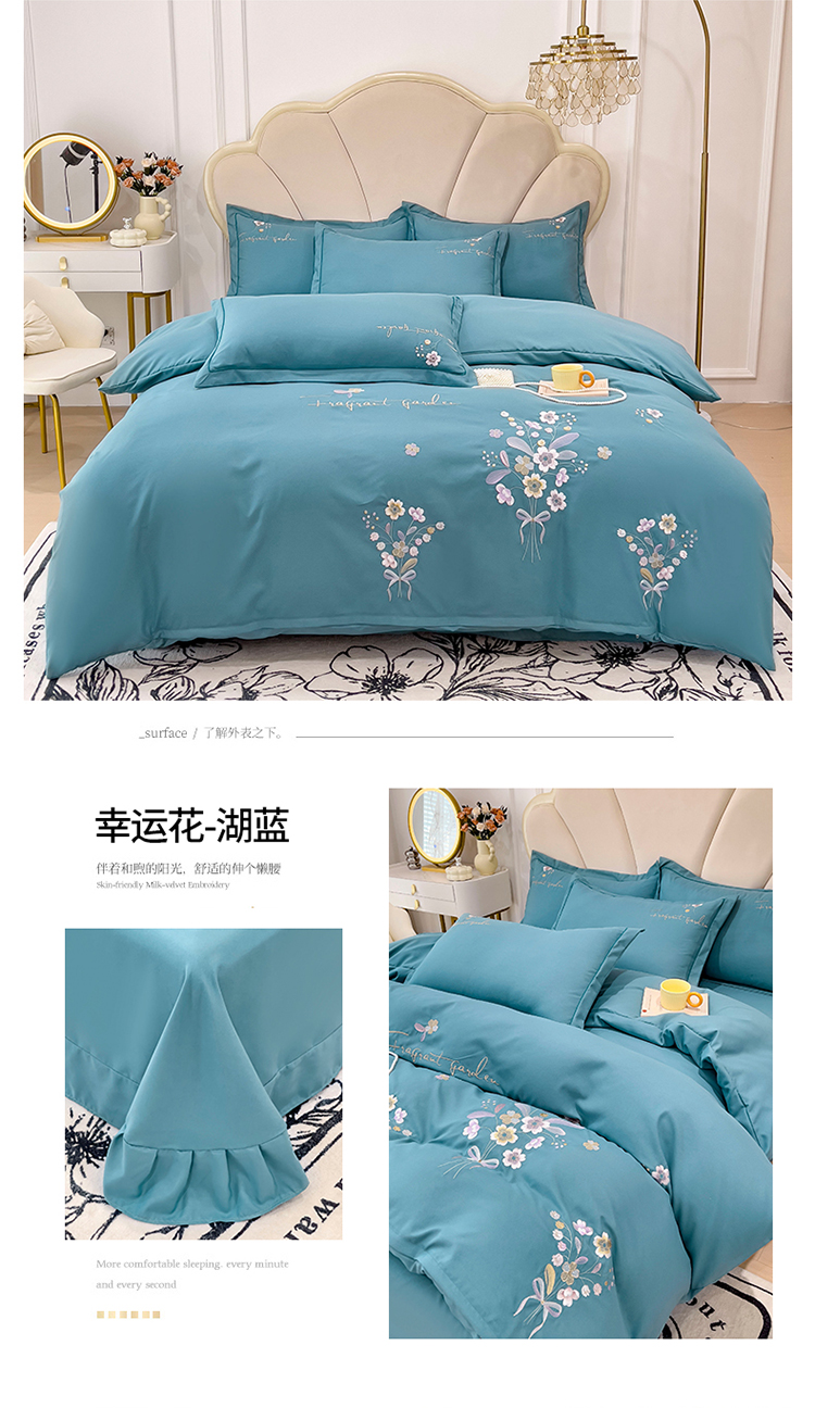 商品名称:金米诺 2024新款水洗磨毛刺绣四件套 幸运花-湖蓝