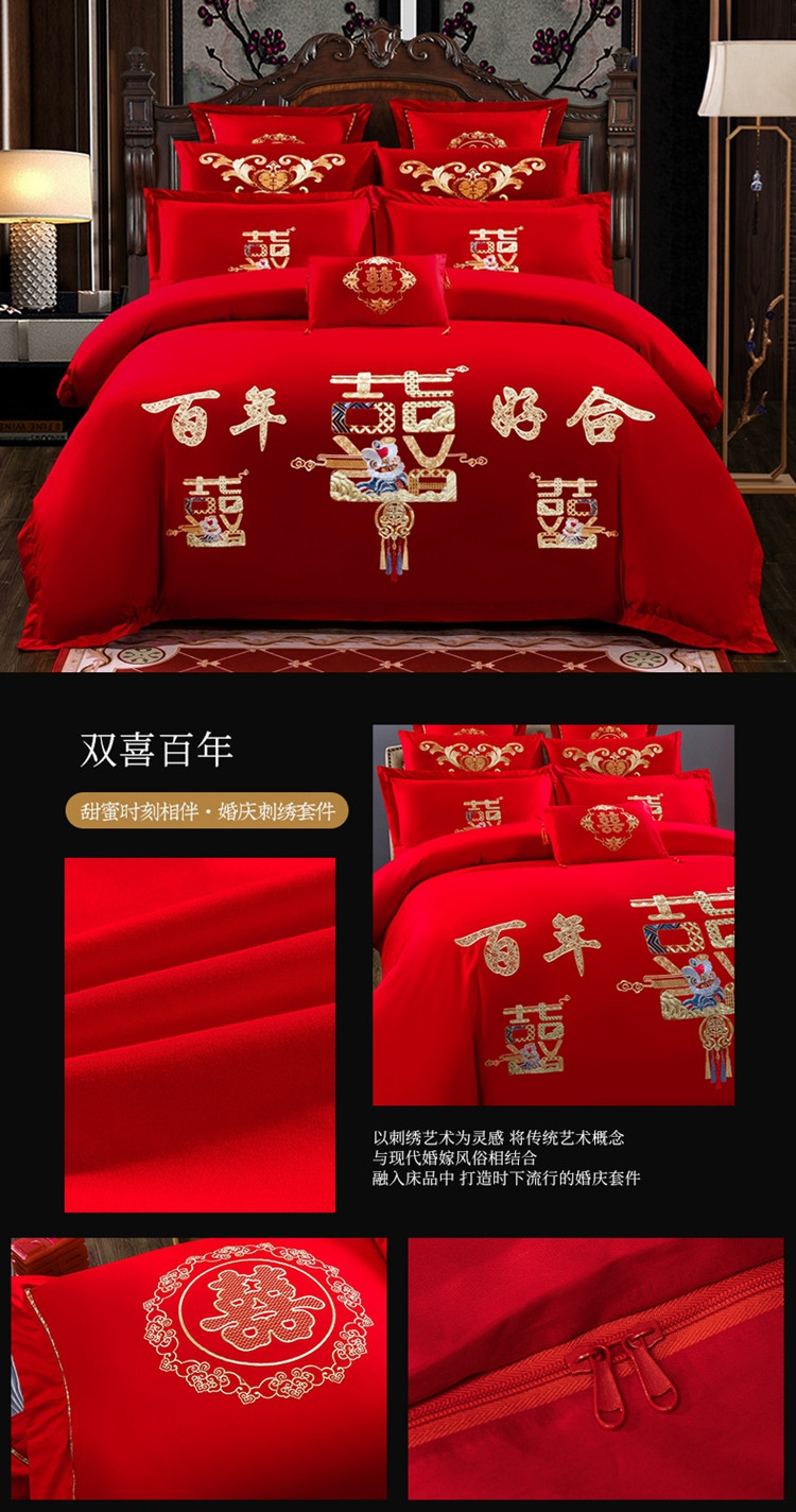 商品名称:慕她婚庆四件套大红色大花结婚全棉纯棉刺绣花多件套直播 双喜百年