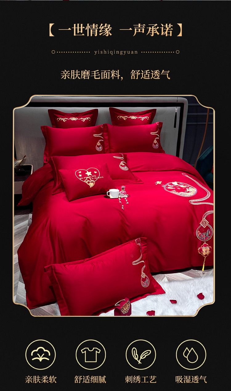 商品名称:慕她婚庆四件套大红色结婚加厚磨毛刺绣花多件套直播 幸福如意