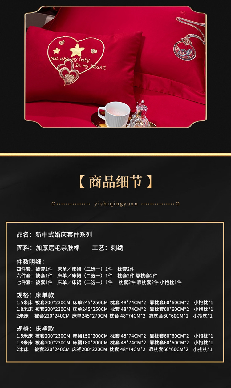 (总)慕她家纺 2025新款磨毛婚庆四件套结婚刺绣花床品六喜庆,爱的约定,百年同心,恩恩爱爱,花好月圆,两心相悦,龙凤传情,龙凤欢腾,龙凤情缘,玫瑰情缘,米兰风情,盛世龙凤,盛世庄园 大红,盛世庄园 经典灰,盛世庄园 孔雀兰,盛世庄园 浪漫玉,盛世庄园 魅力紫,盛世庄园 雅豆沙,双喜情缘,天缘巧合,天作之合,喜笑颜开,幸福满园,幸福如意,一见钟情,鸳鸯同心,张灯结彩