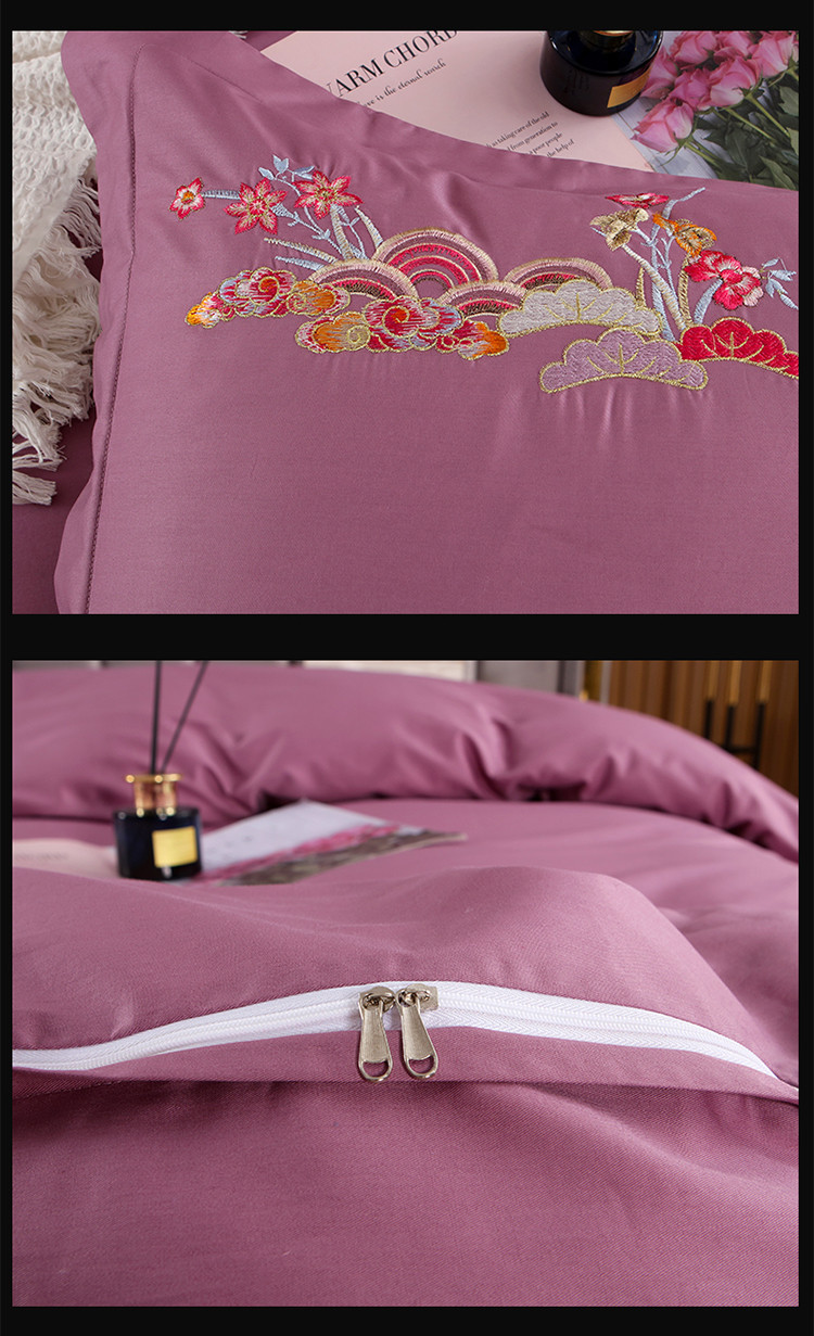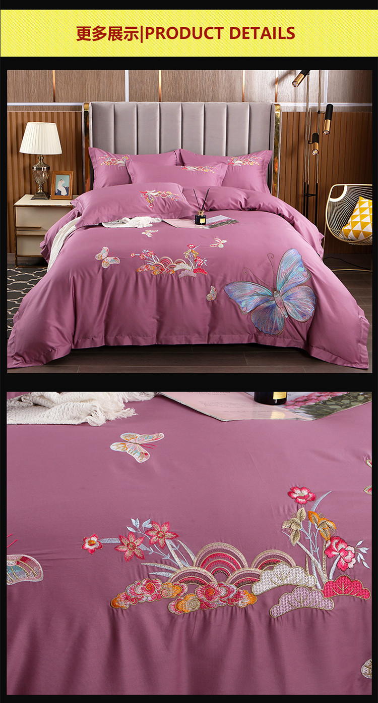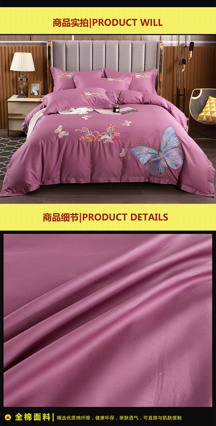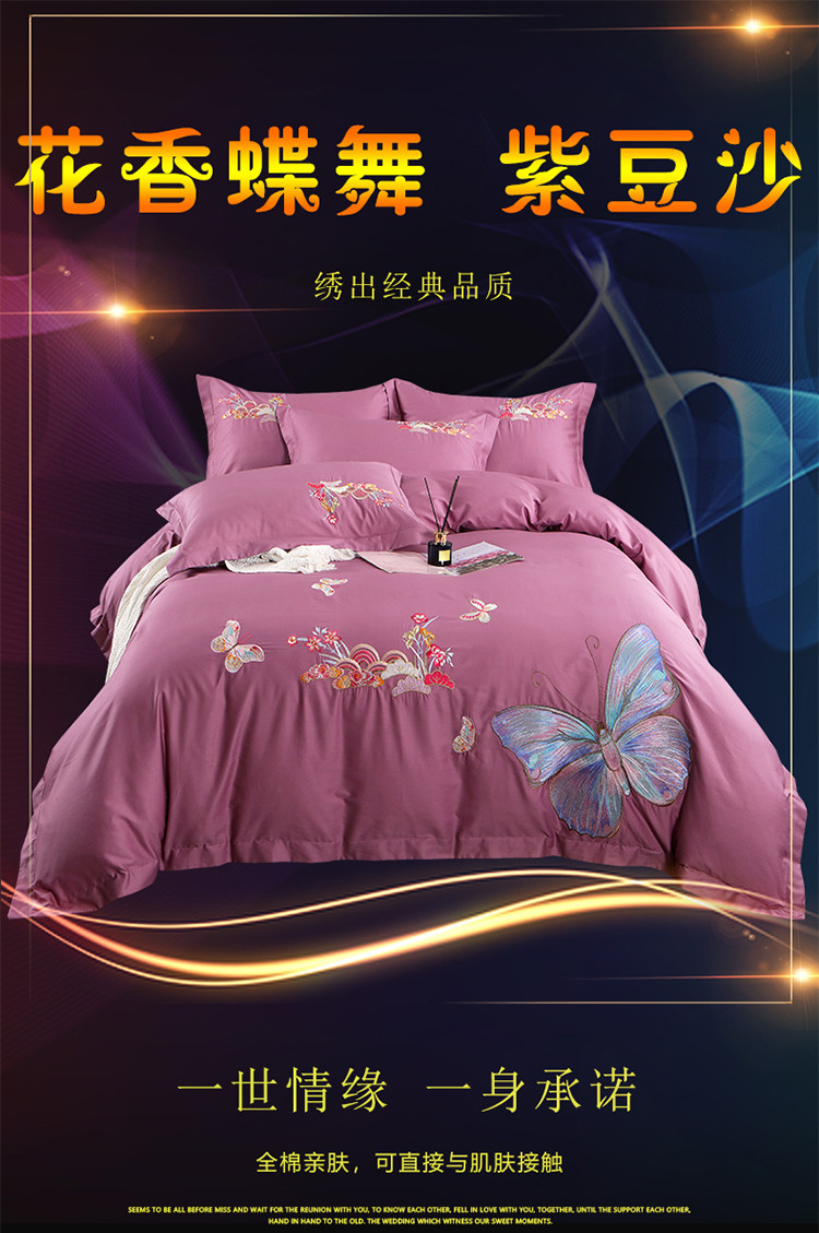商品名称:慕她婚庆四件套大红色结婚全棉纯棉刺绣花多件套直播 花香蝶舞紫豆沙