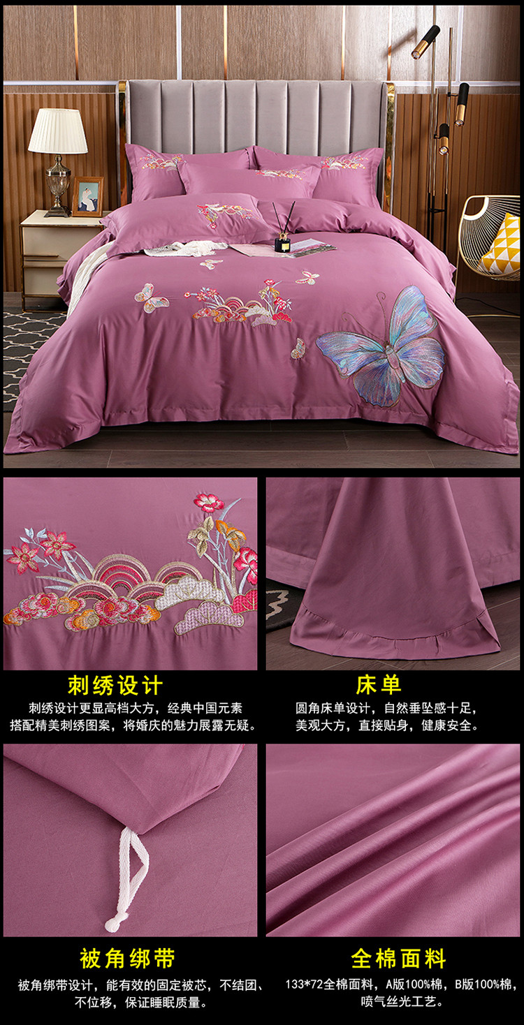 慕她婚庆四件套大红色结婚全棉纯棉刺绣花多件套直播 花香蝶舞紫豆沙