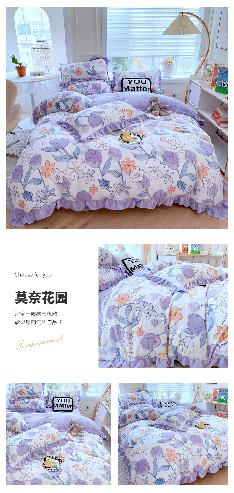 商品名称:吾欢心 2024新款韩版花边牛奶绒四件套 莫奈花园