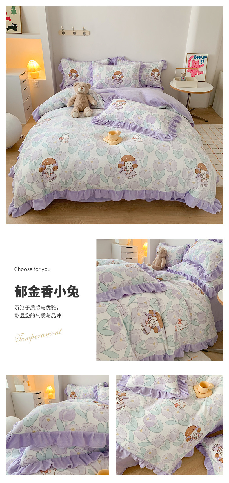 商品名称:吾欢心 2024新款韩版花边牛奶绒四件套 郁金香小兔