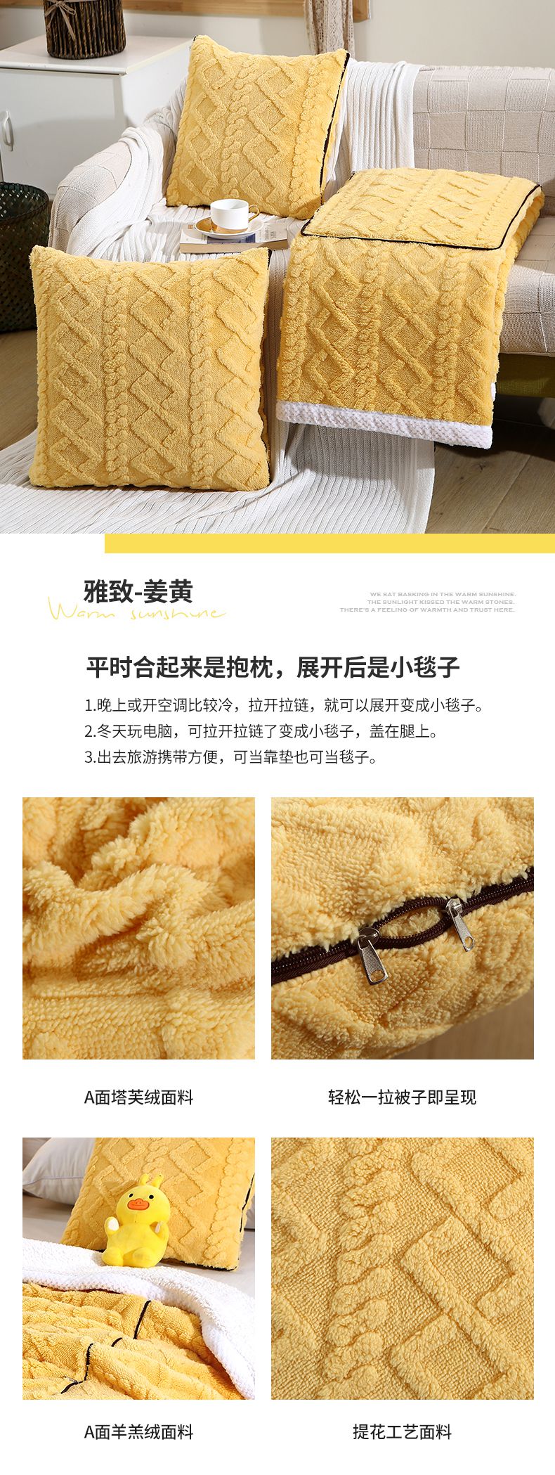 商品名称:伊可爱抱枕被 2023新款塔芙绒提花抱枕被毛毯 雅致姜黄