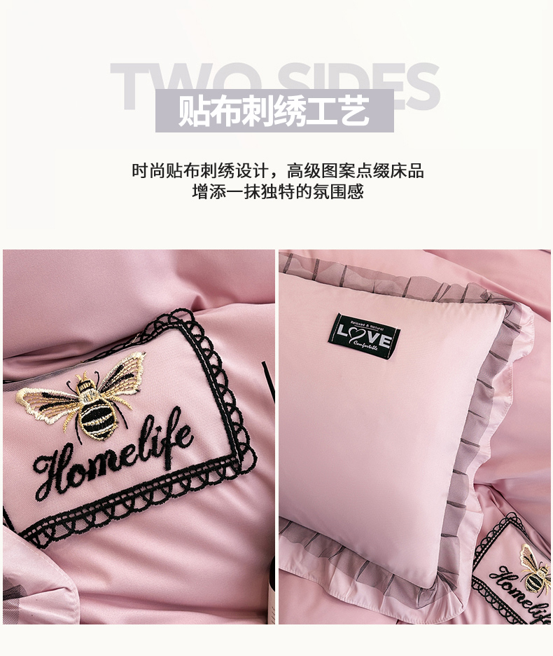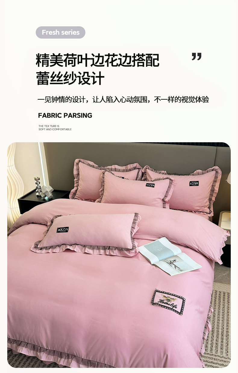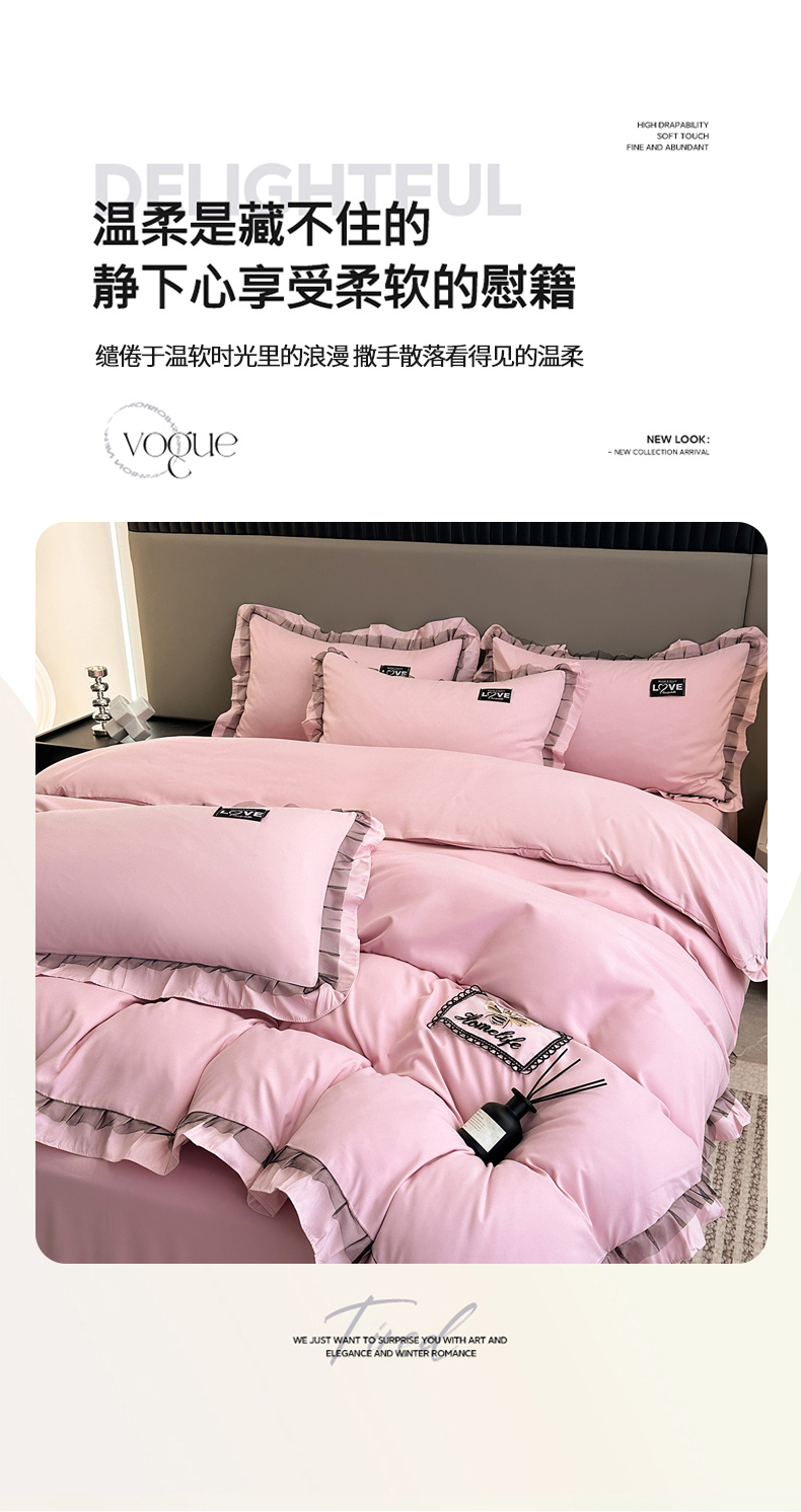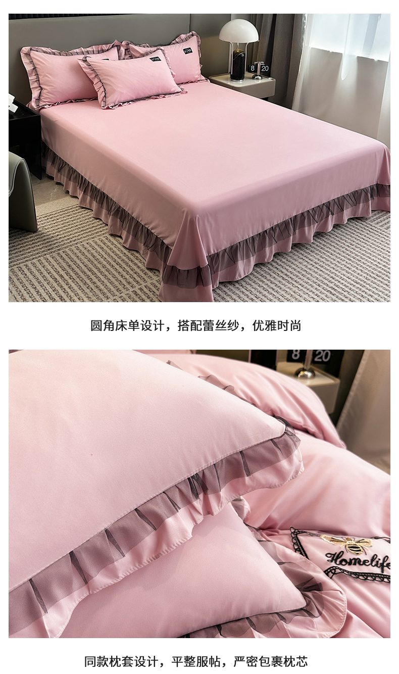商品名称:小主驾到 2023新款韩版公主风荷叶边少女心四件套黑色蕾丝纱-画纱 画纱裸粉