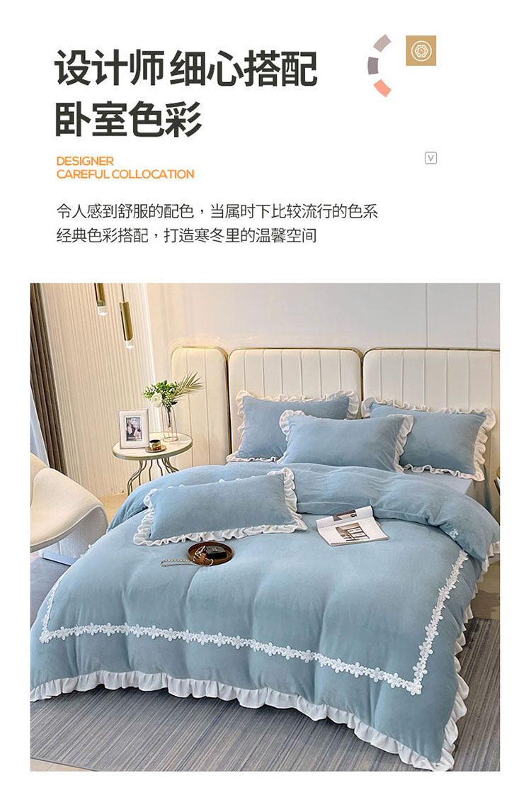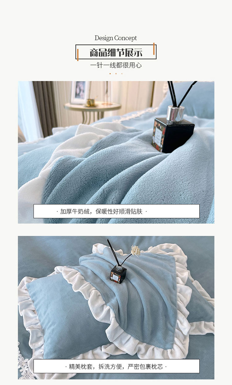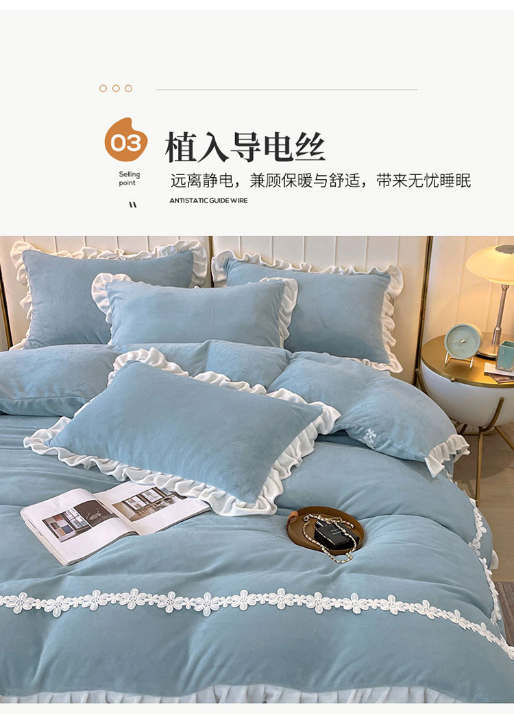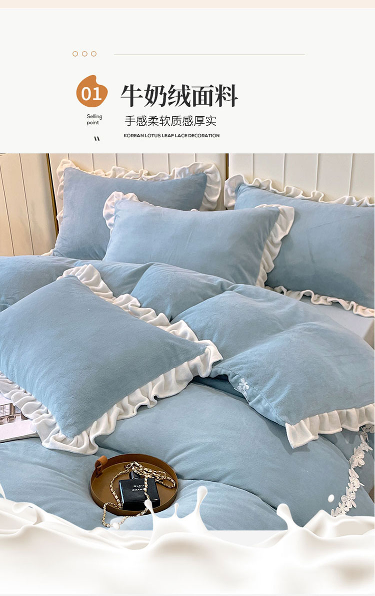 商品名称:2023新款韩版水溶花边牛奶绒四件套--安娜系列 安娜-天空蓝