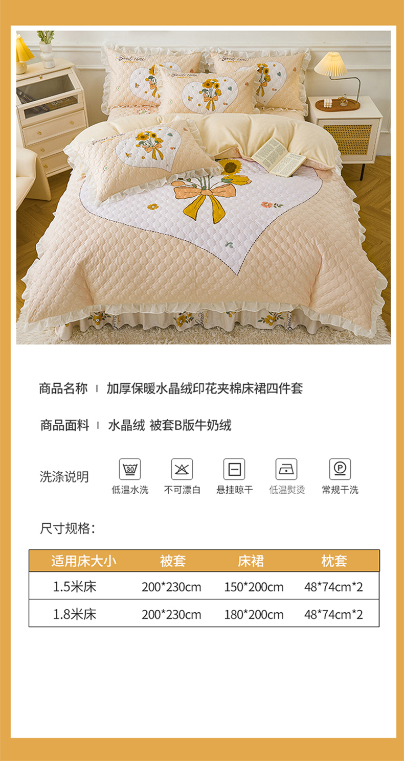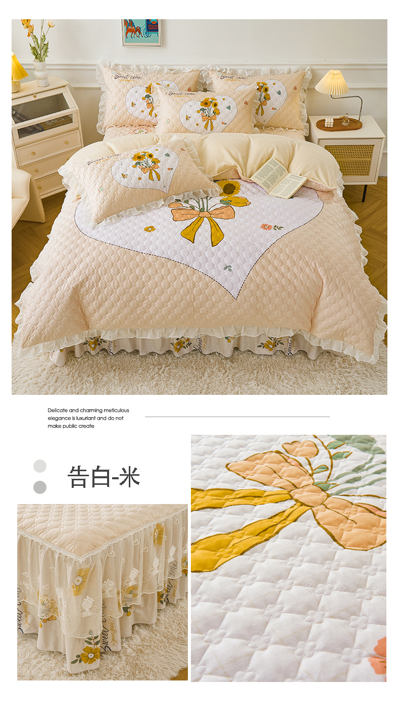当前位置: 91家纺网 > 商品网购 > 床品套件 > 四件套 > 水晶绒四件套 > 爱思佳 2023新款180g水晶绒印花夹棉床裙款四件套卡通系列告白-米