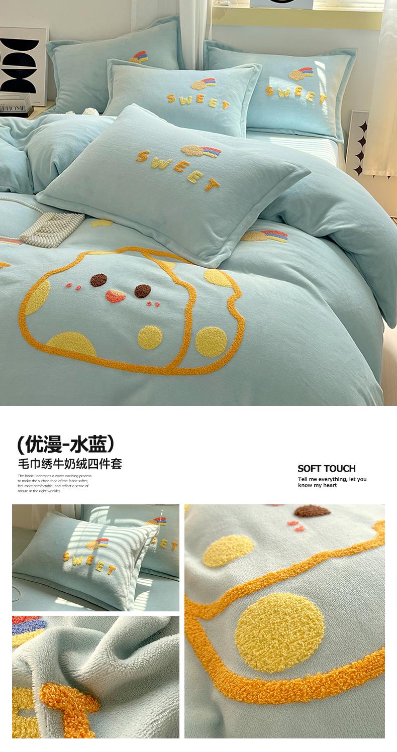 商品名称:凡客家居 2023新款毛巾绣牛奶绒四件套 优漫-水蓝