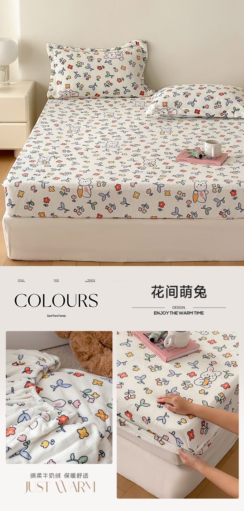 商品名称:时光里 2023新款全消光加厚牛奶绒印花单品单床笠 花间萌兔