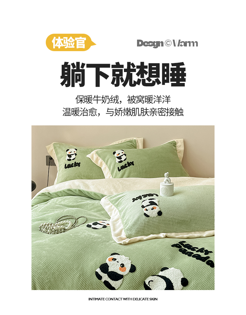 懒猫家纺 2024新款【华夫格绣花】牛奶绒四件套 熊猫团子