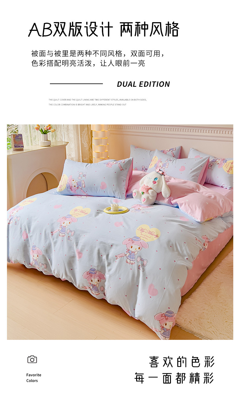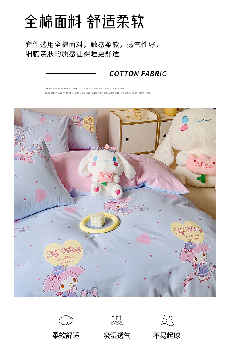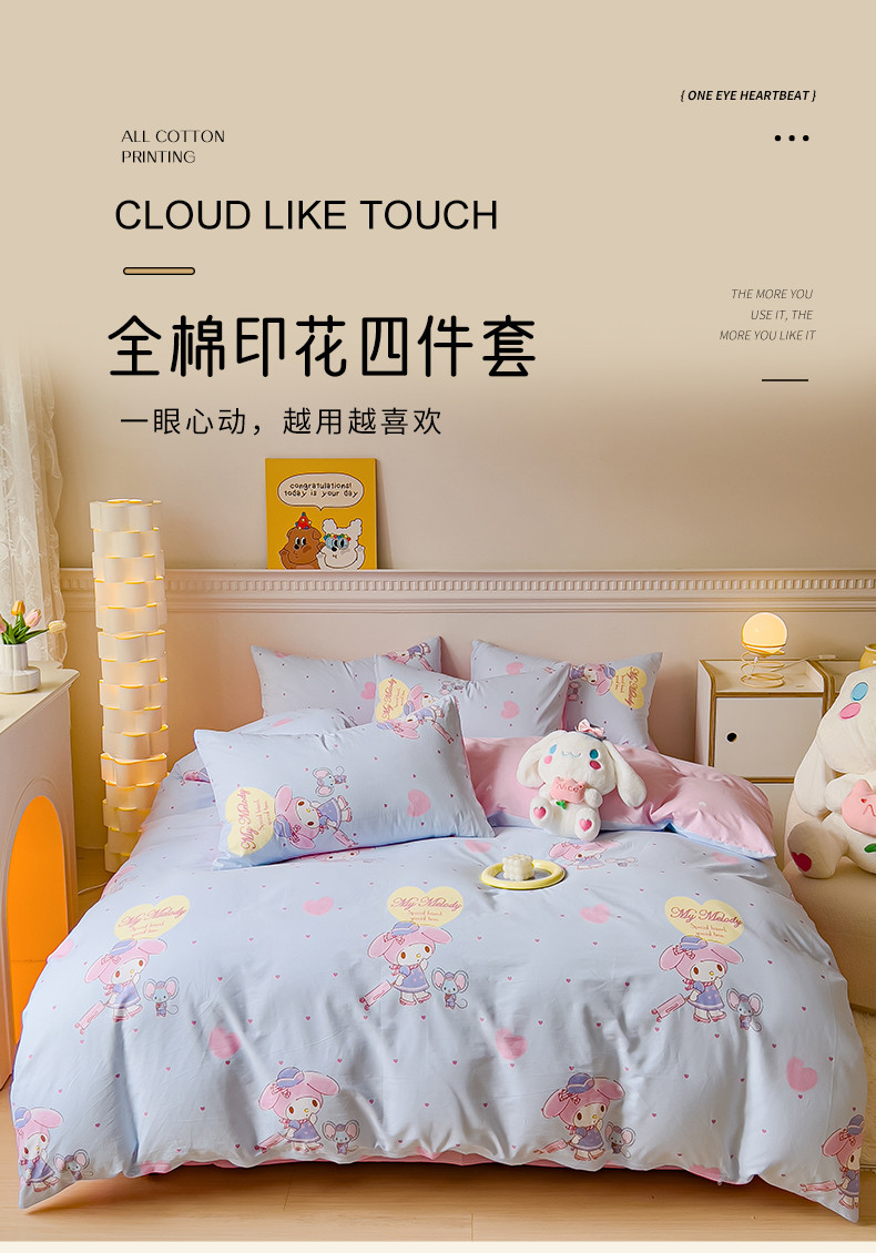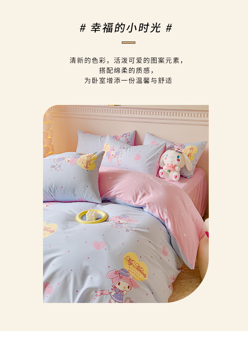 当前位置: 91家纺网 > 商品网购 > 床品套件 > 四件套 > 全棉普通四件套 > 金丝鸟家纺 2023新款全棉印花三利欧库洛米系列四件套 小兔和老鼠