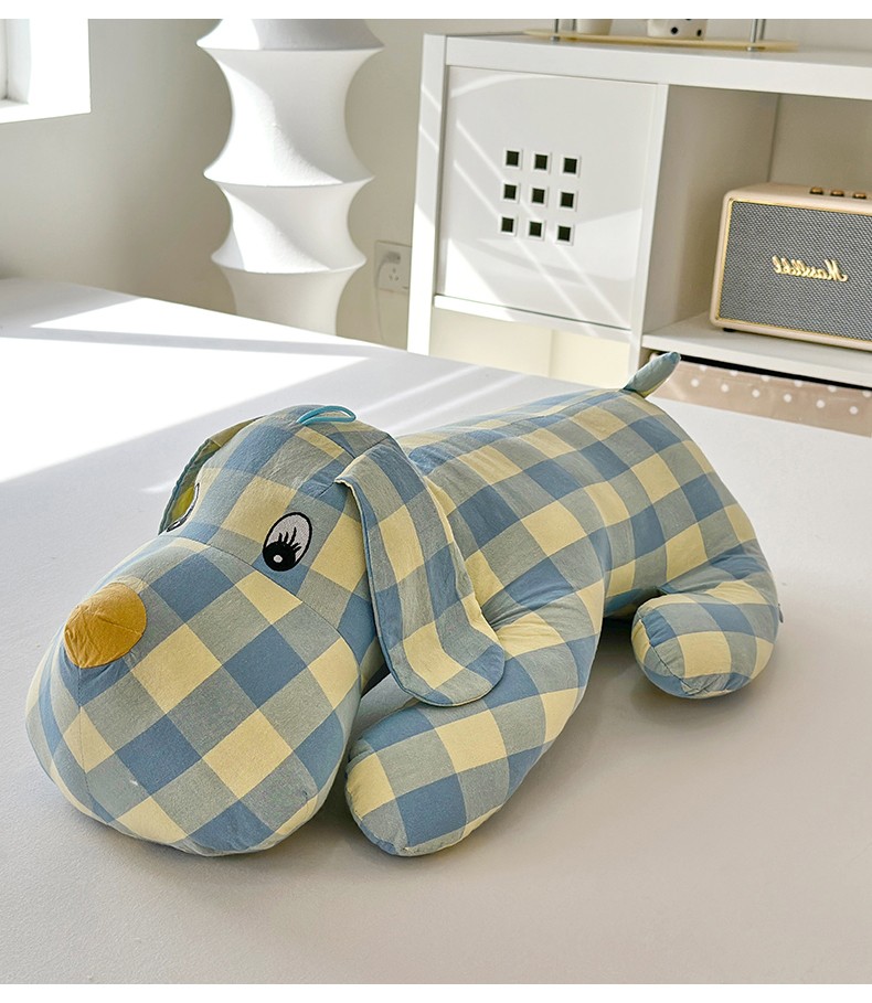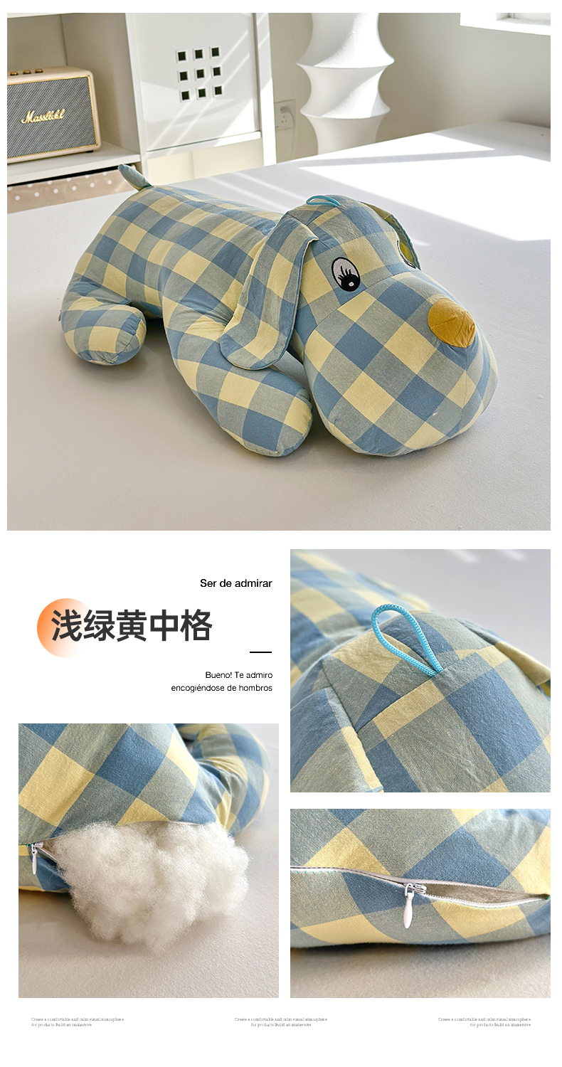 商品名称:三沁 2023新款直播爆款福利款纯棉色织水洗棉格子小狗抱枕 浅绿黄中格