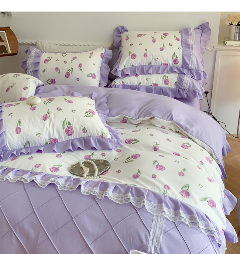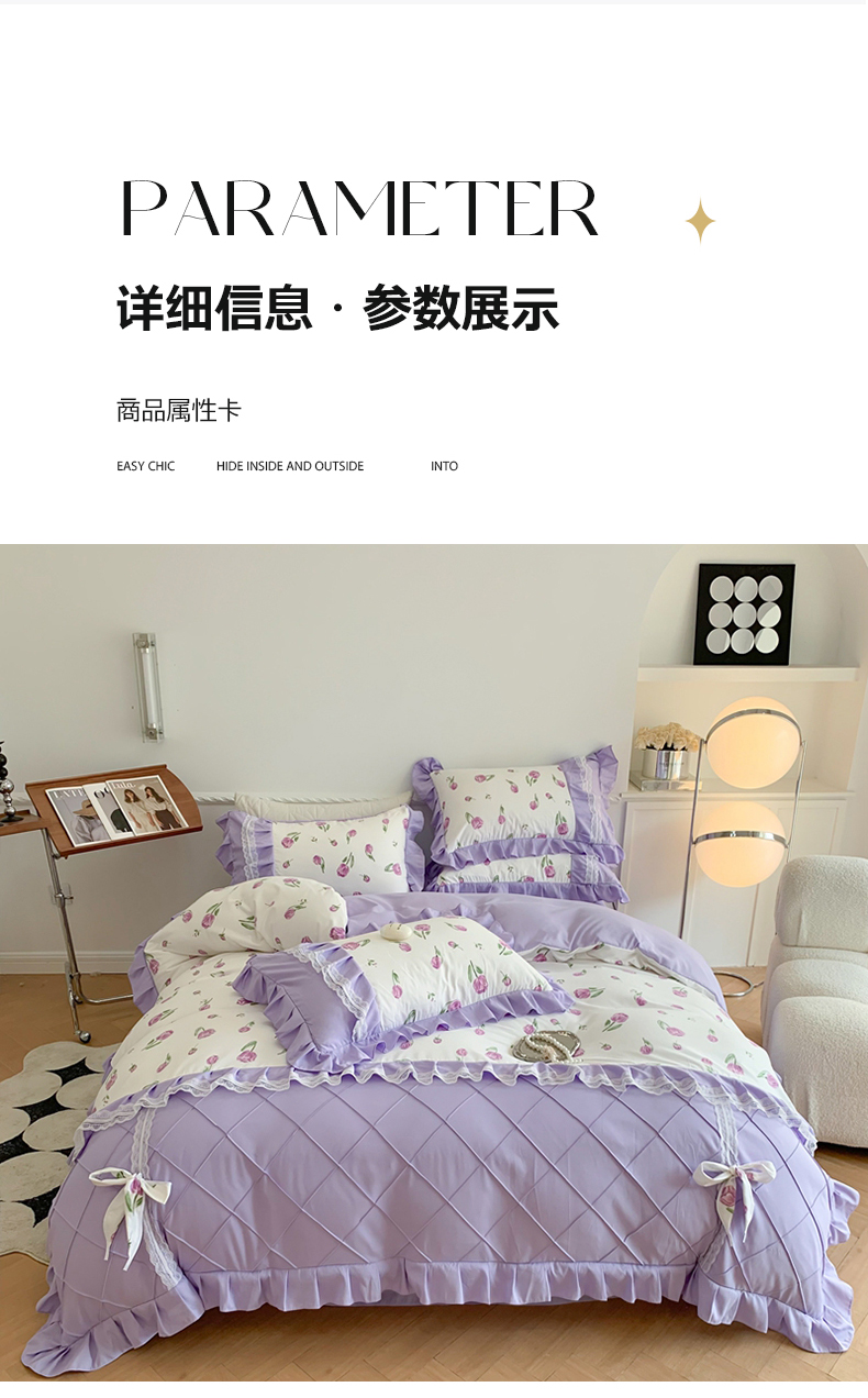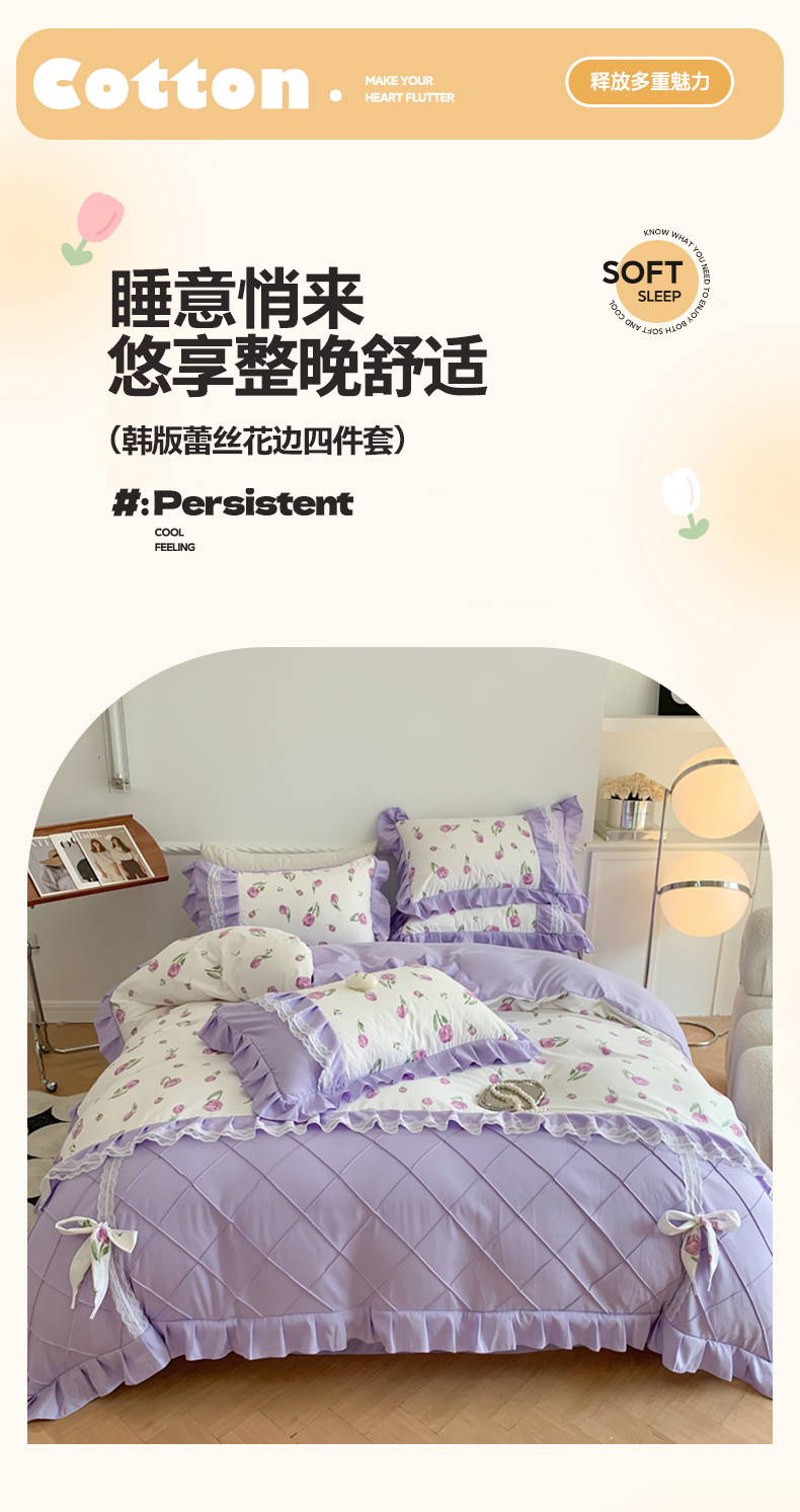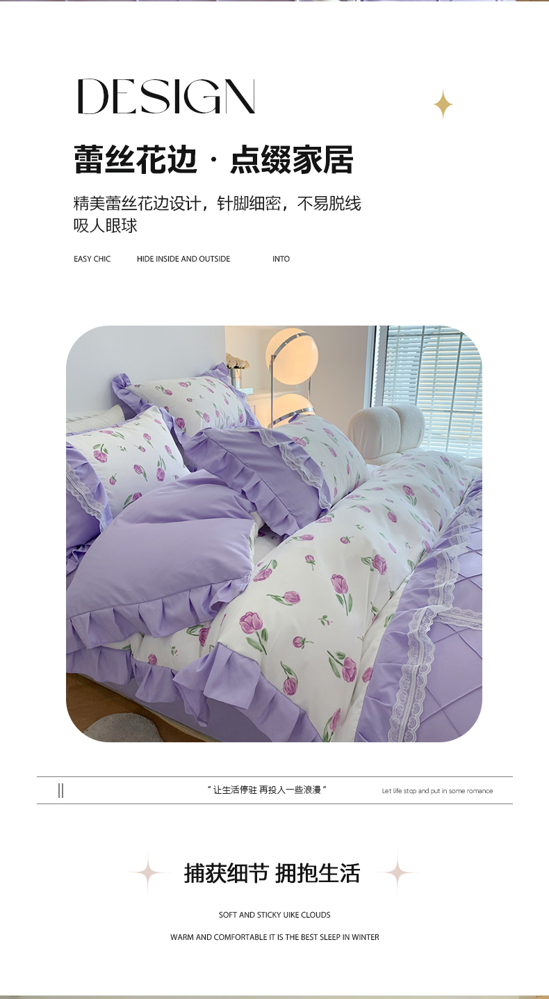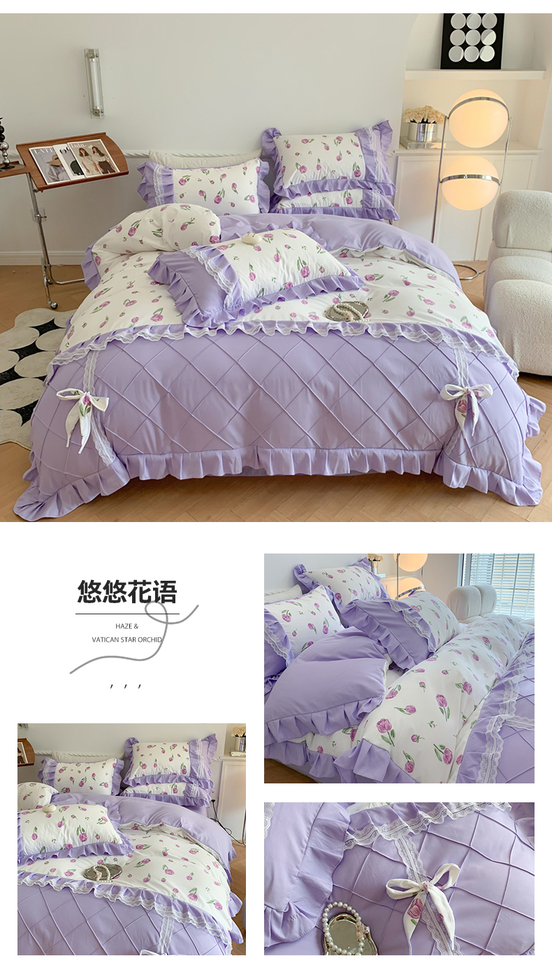 商品名称:吾欢心 2025新款蝴蝶结款韩版蕾丝花边四件套 紫色郁金香