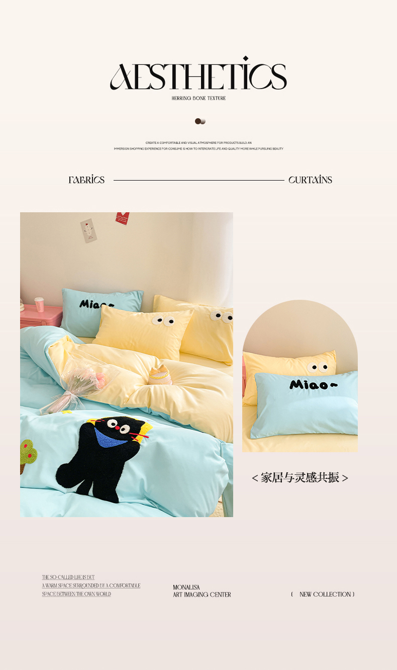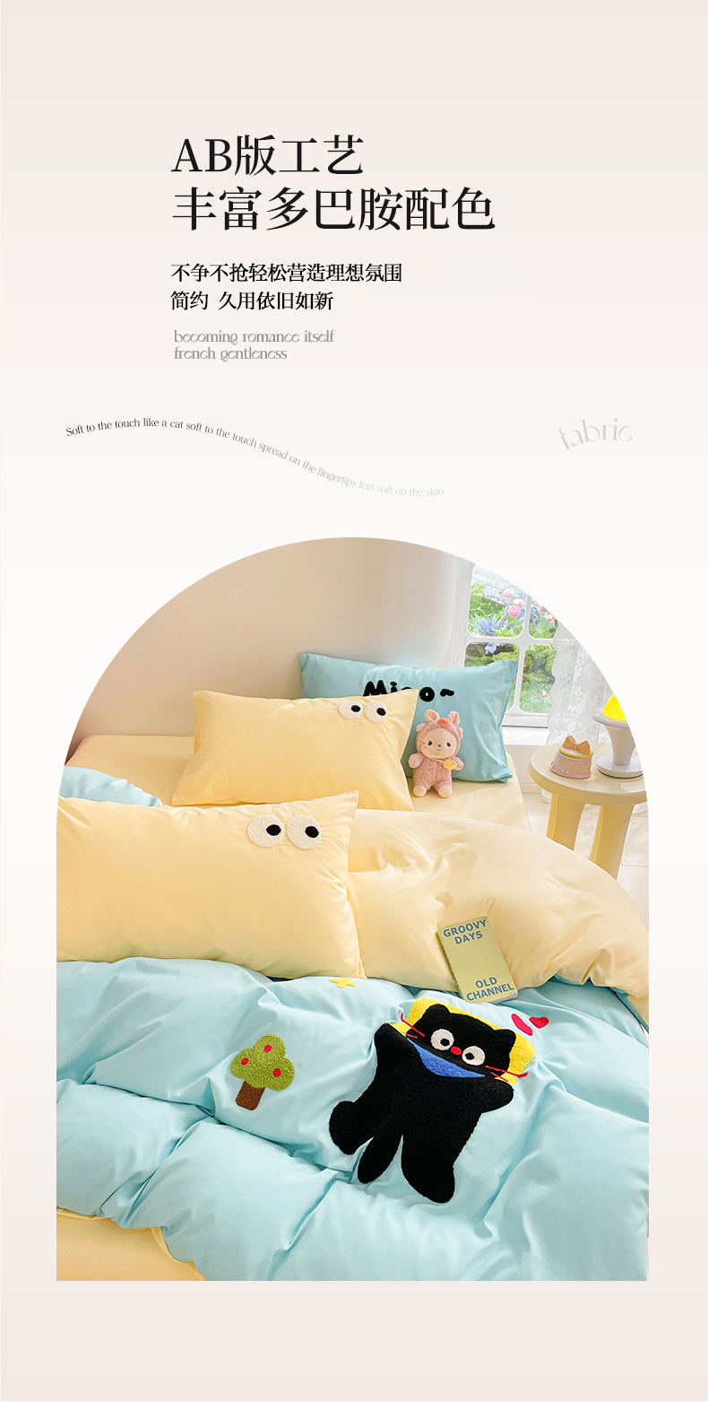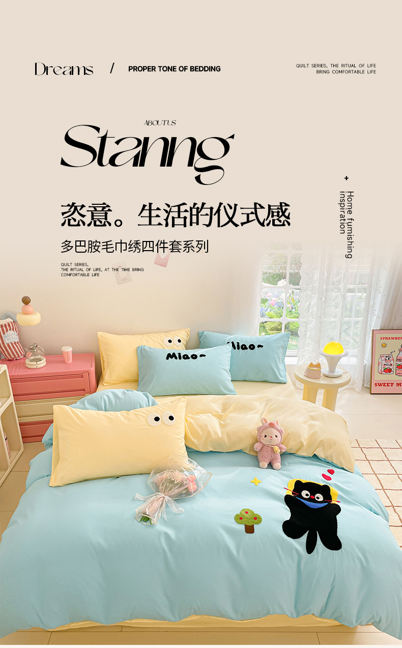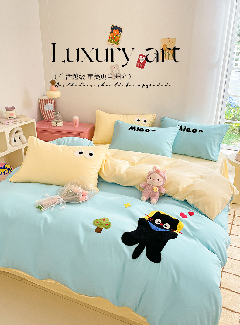 当前位置: 91家纺网 > 商品网购 > 床品套件 > 四件套 > 水洗棉四件套 > 我心家纺 2024新款亲肤多巴胺水洗棉毛巾绣四件套 贪睡猫-蓝黄
