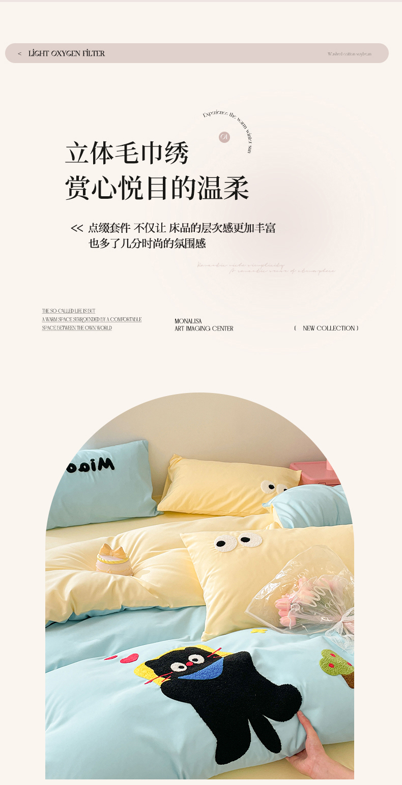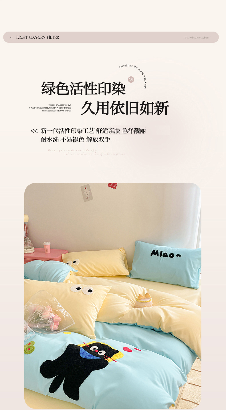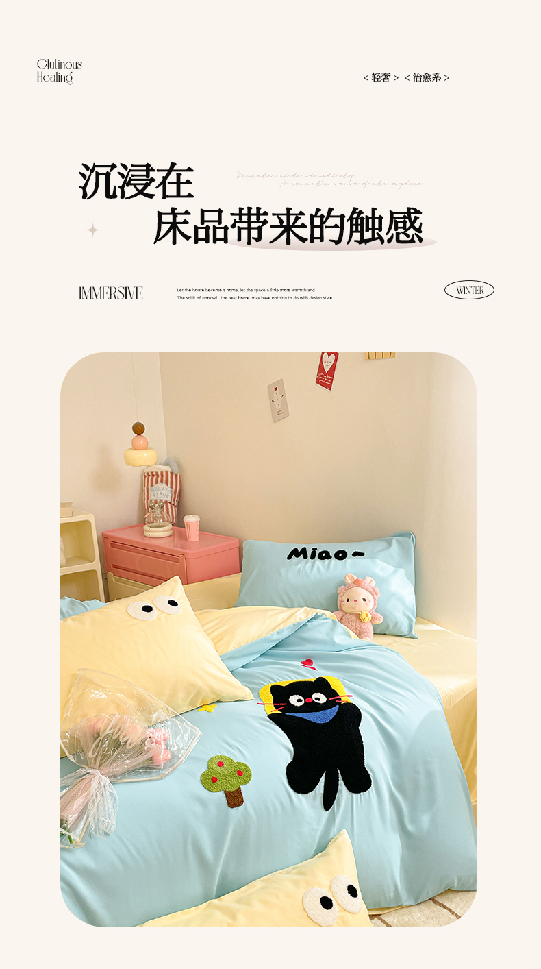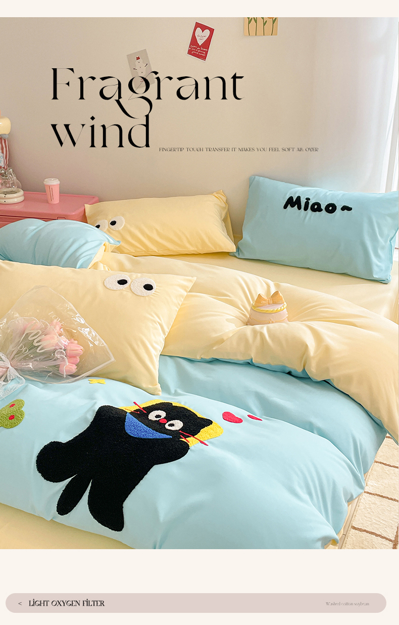 当前位置: 91家纺网 > 商品网购 > 床品套件 > 四件套 > 水洗棉四件套 > 我心家纺 2024新款亲肤多巴胺水洗棉毛巾绣四件套 贪睡猫-蓝黄