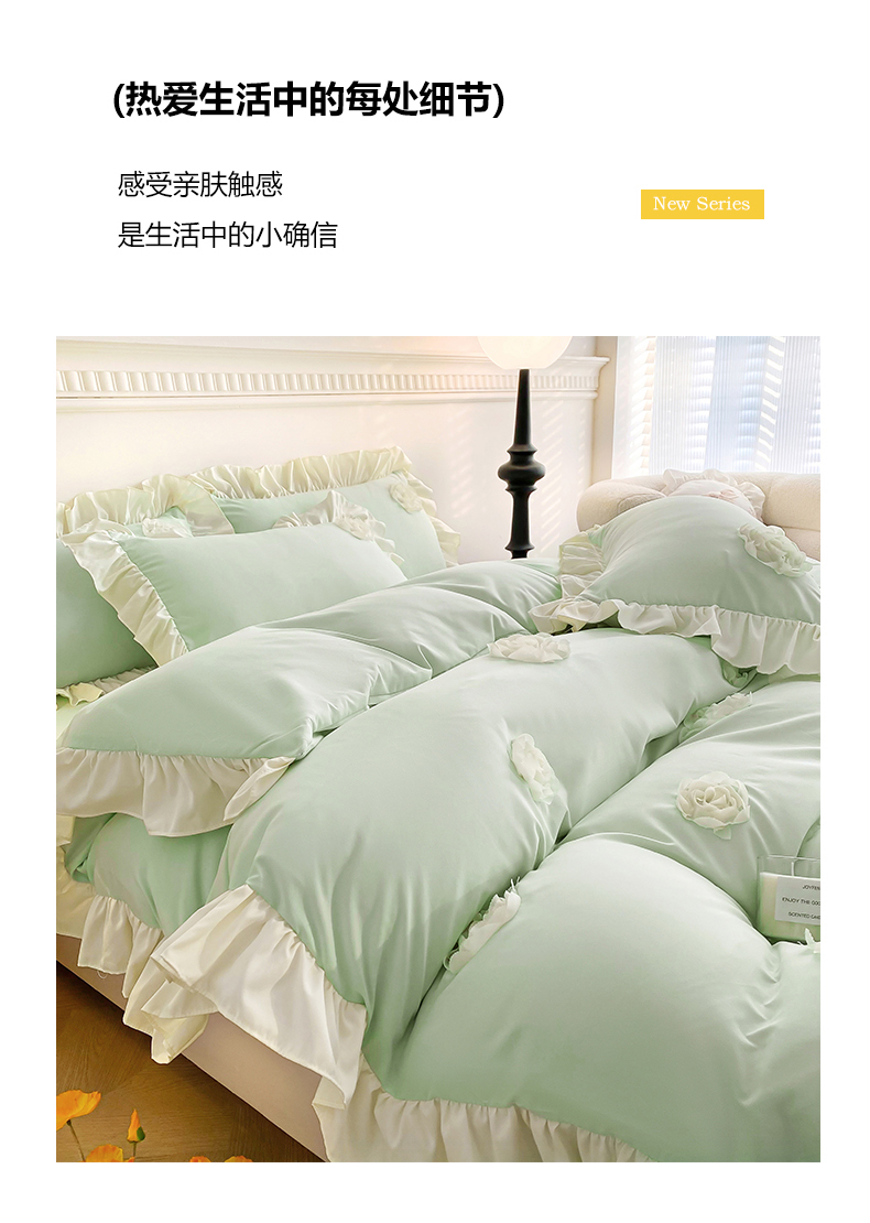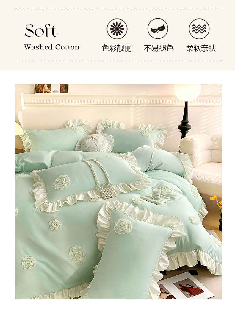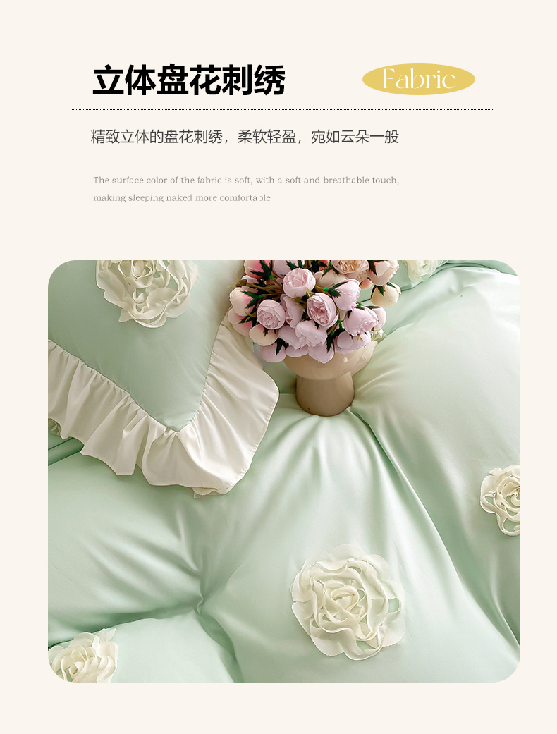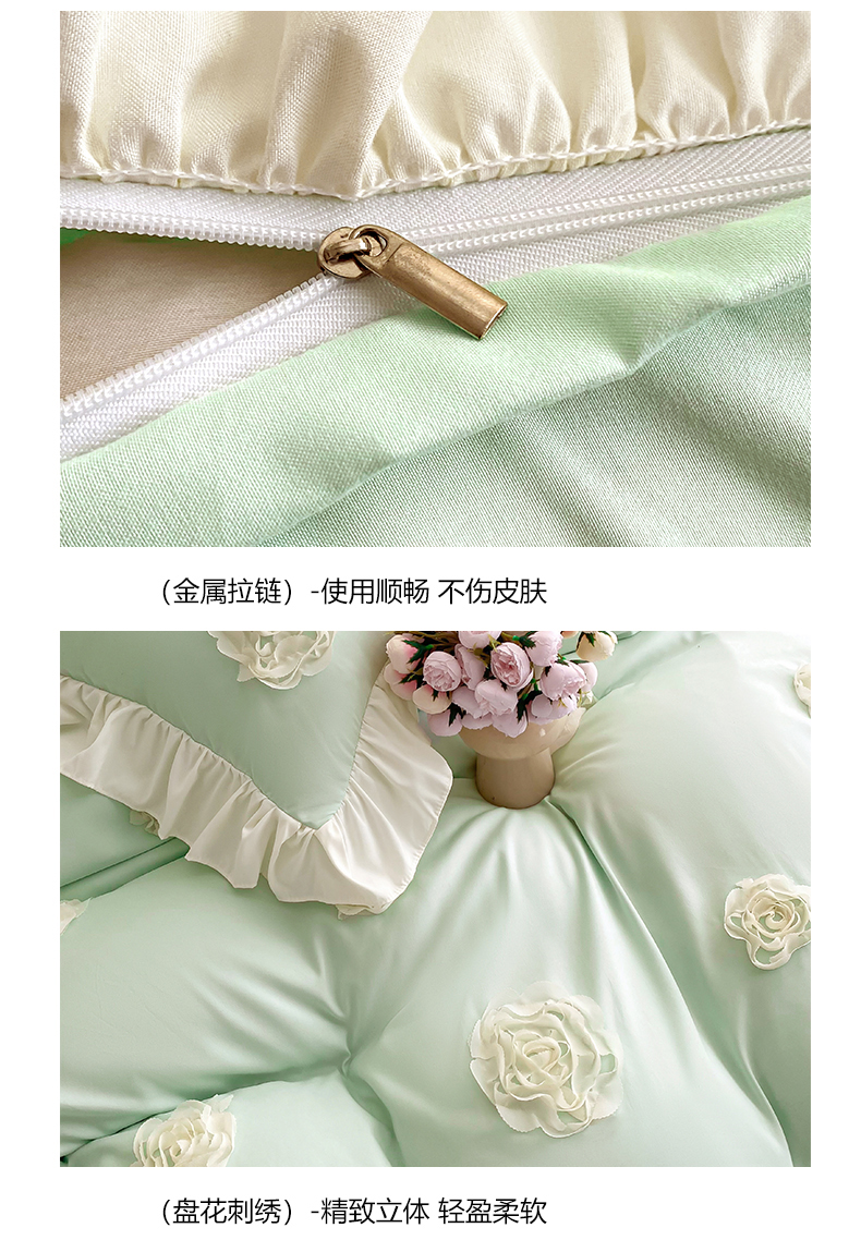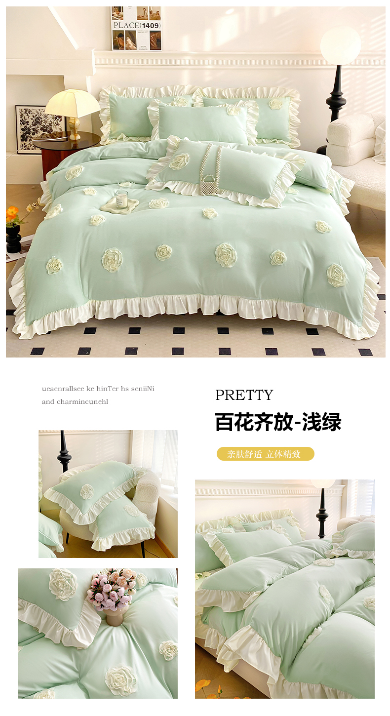 商品名称:水洗亲肤棉立体刺绣四件套公主风四件套 百花齐放-浅绿