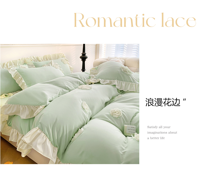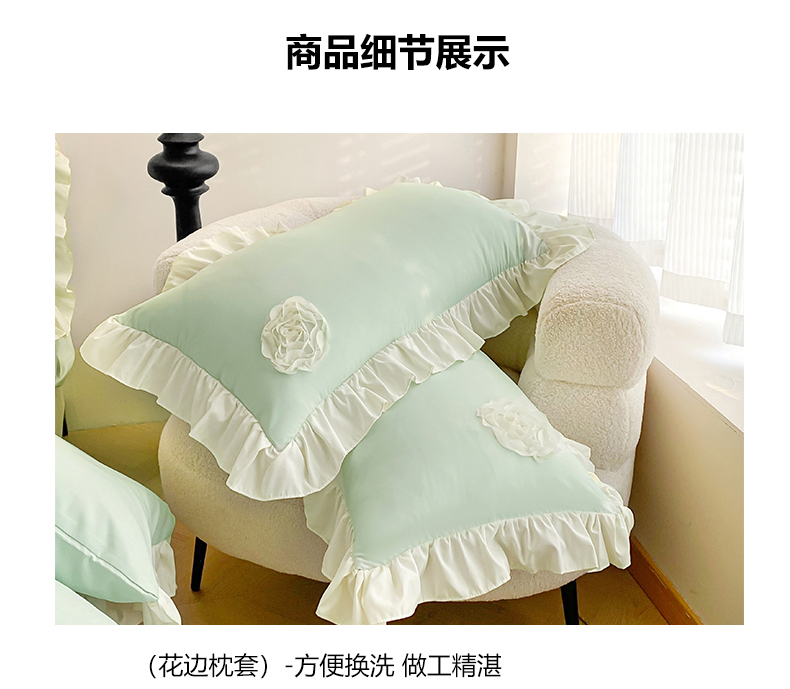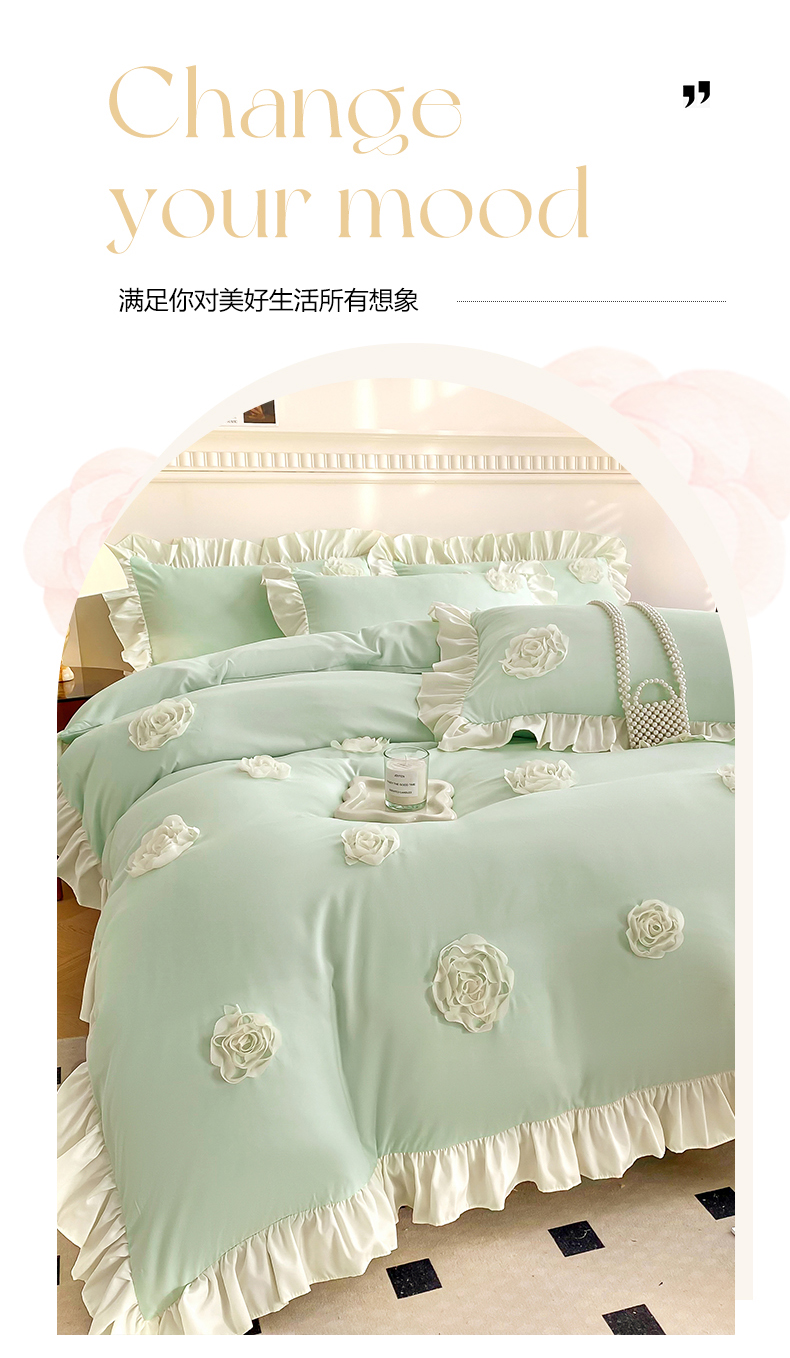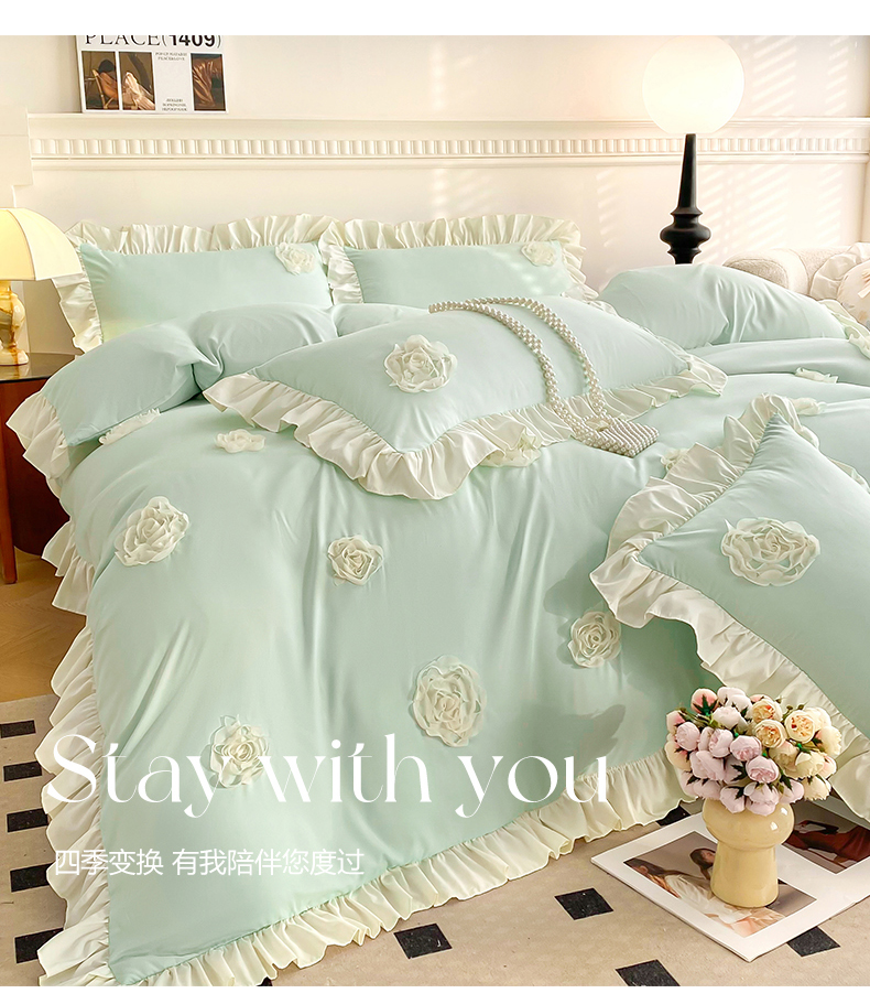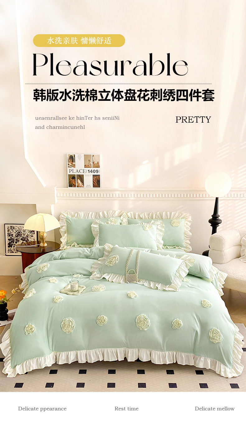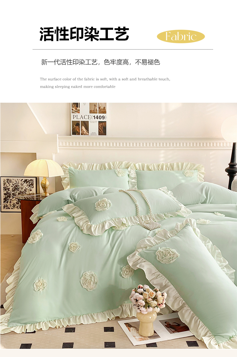 商品名称:水洗亲肤棉立体刺绣四件套公主风四件套 百花齐放-浅绿