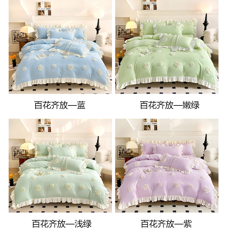 (总)富盛家纺 2024新款水洗亲肤棉立体盘花刺绣四件套公主风四件套,百花齐放-紫,百花齐放-嫩绿,百花齐放-粉,百花齐放-浅绿,百花齐放-黄,百花齐放-白,百花齐放-蓝,百花齐放-豆沙