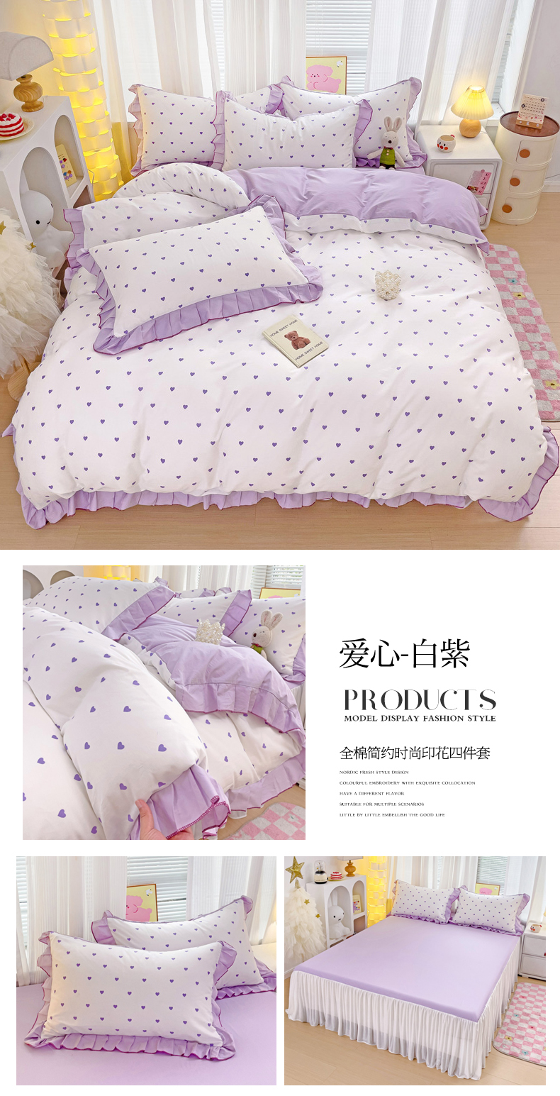 当前位置: 91家纺网 > 商品网购 > 床品套件 > 四件套 > 全棉普通四件套 > 麦朵家居 2024新款床裙款爱心全棉花边四件套 爱心-白紫