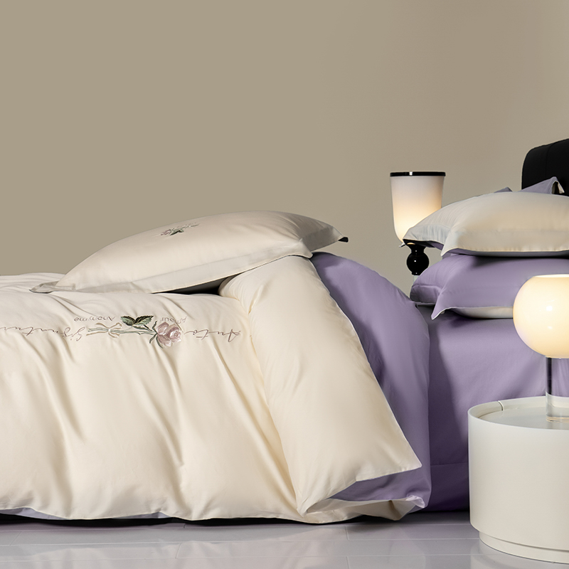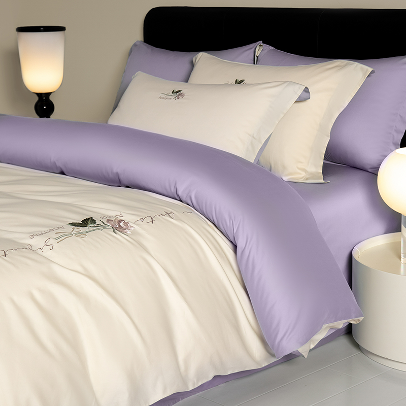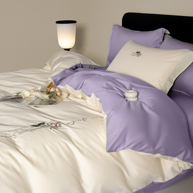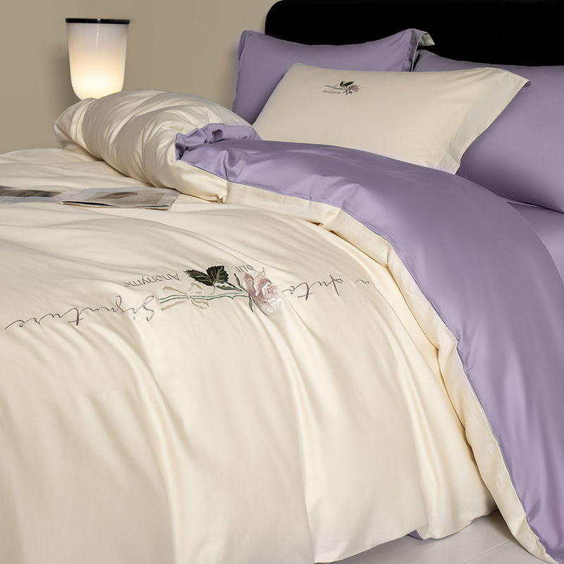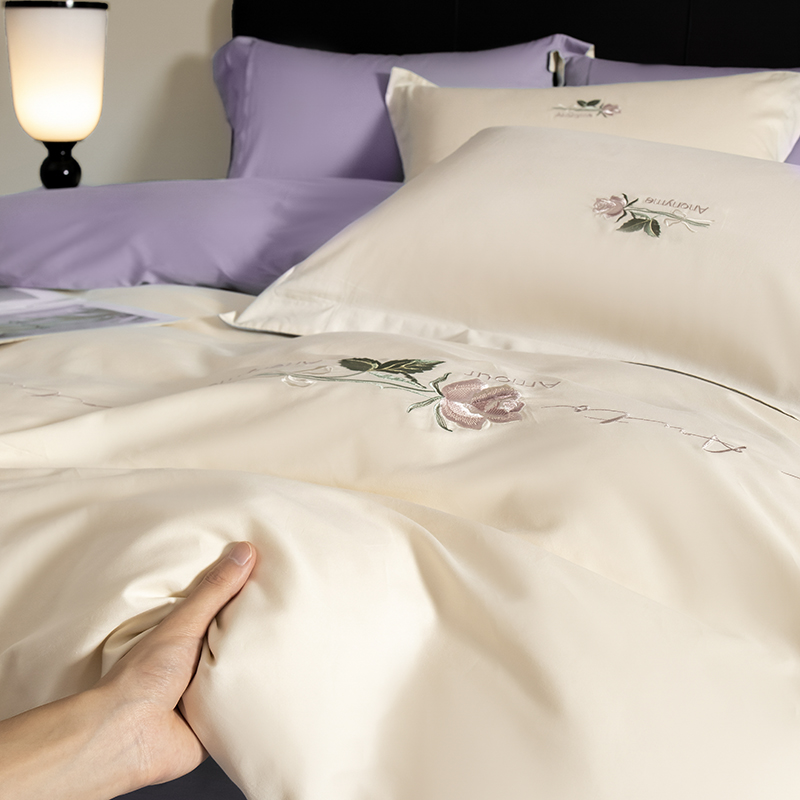 秀色家纺 2025新款轻奢60支贡缎长绒纯棉四件套全棉简约清新刺绣花被套床单高级感 奶昔白+丁香