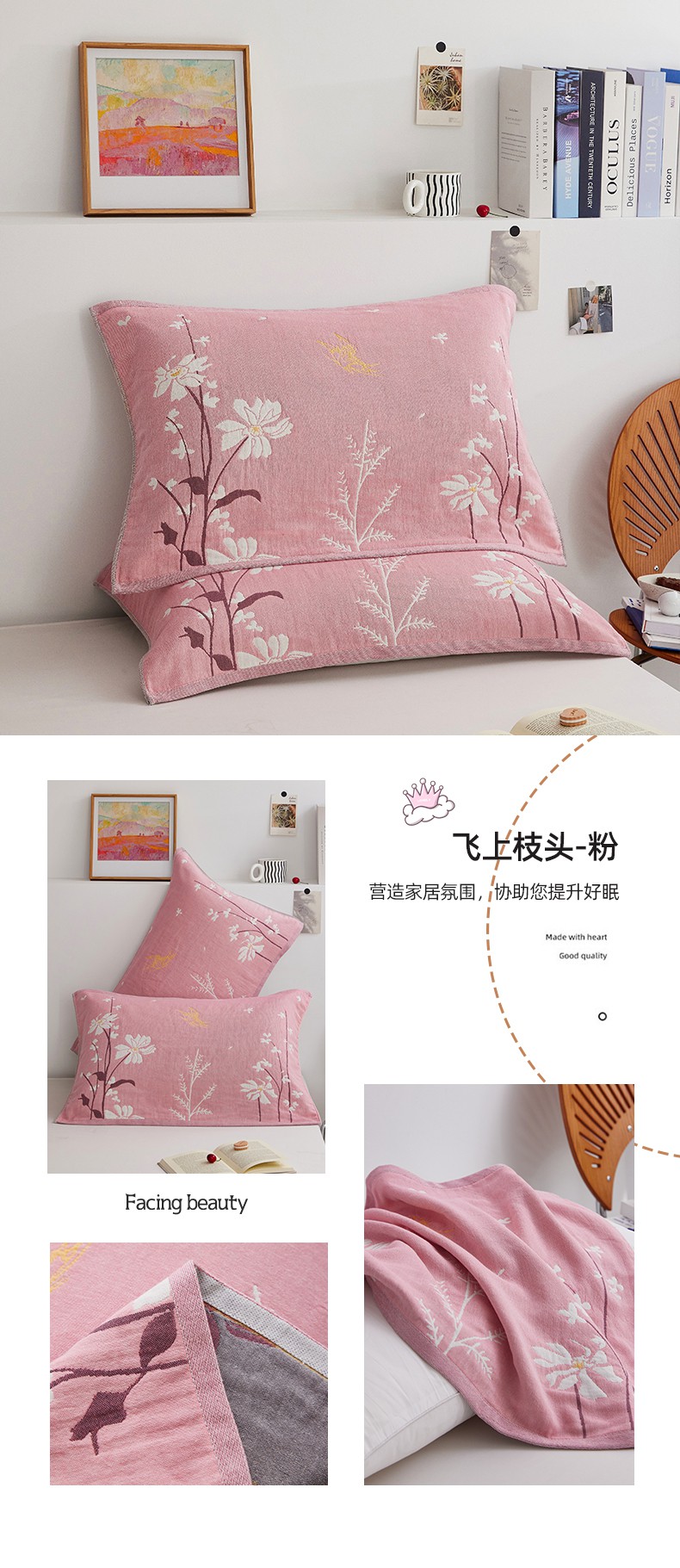 美宜家 2025新款全棉四层纱布中国风枕巾 52*80cm/对飞上枝头-粉