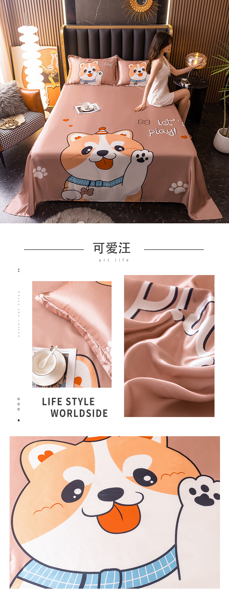 商品名称:梦舒羽 2025新款大版可水洗冰丝床单宿舍床垫保护罩三件套 可爱汪