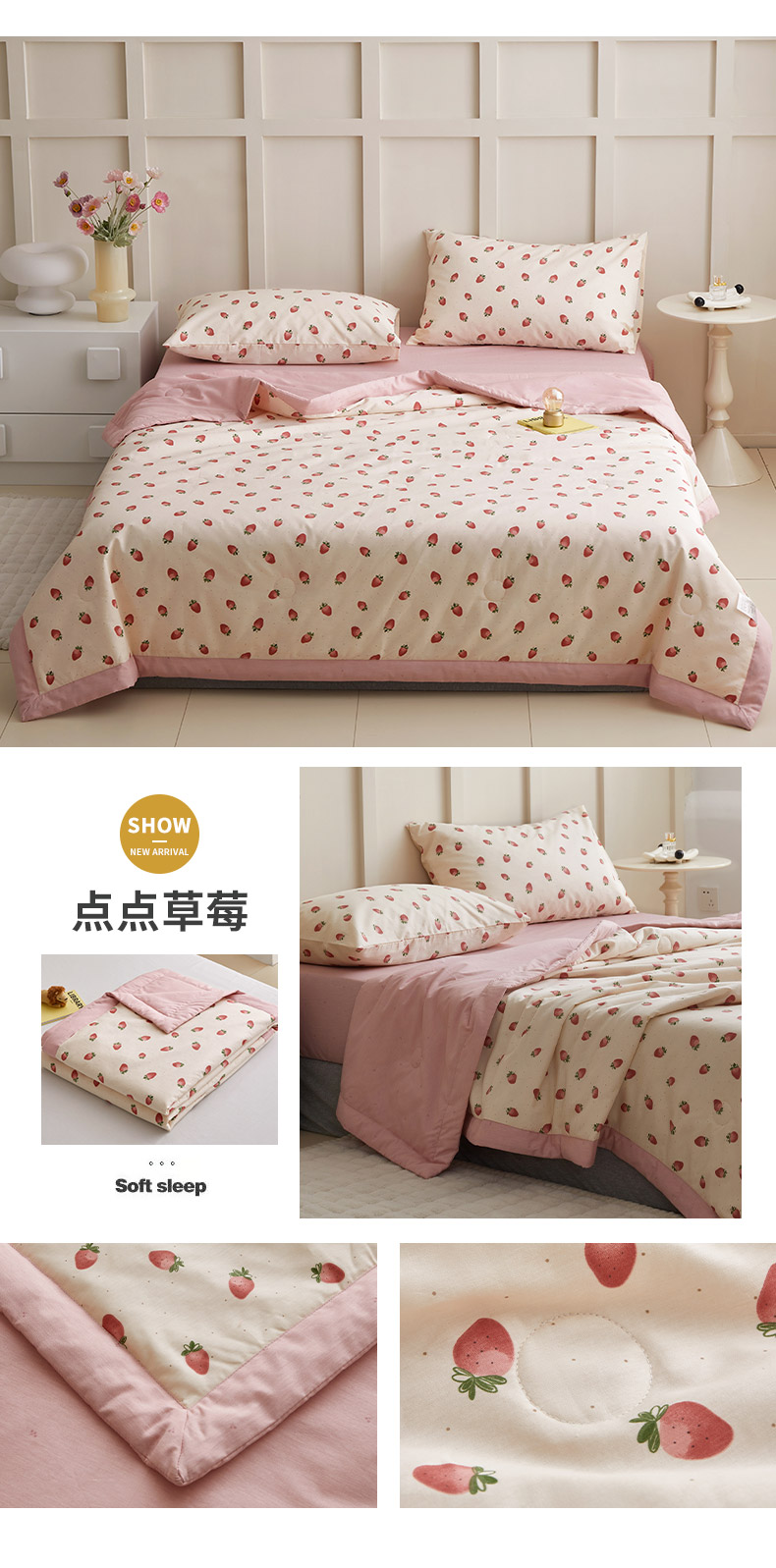 商品名称:怡家居 2024新款全棉印花手包边夏被四件套 点点草莓