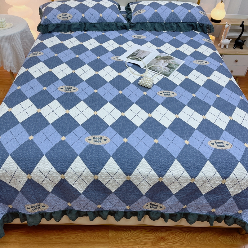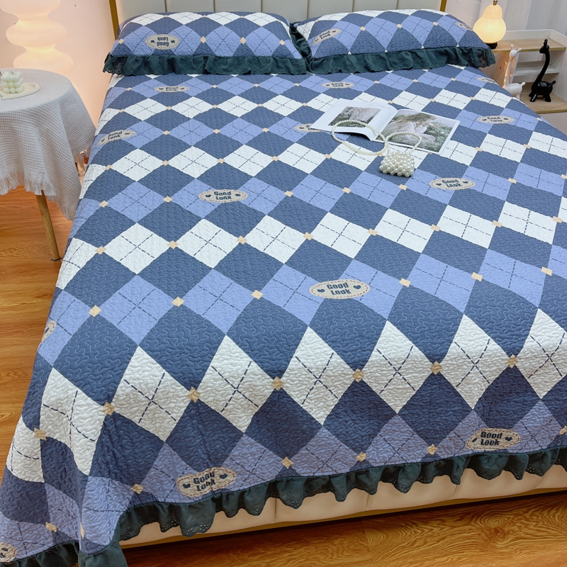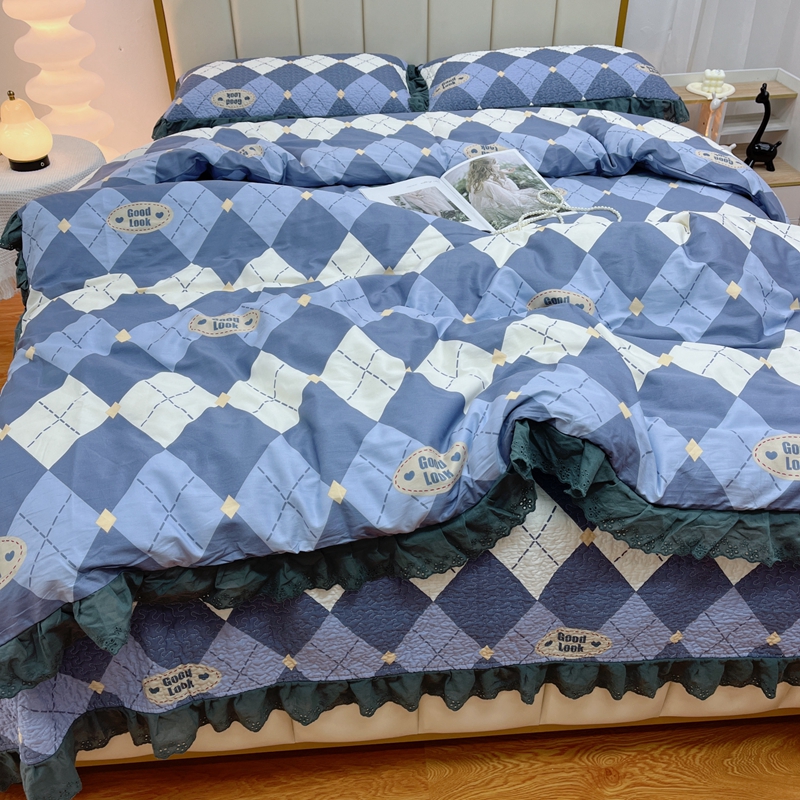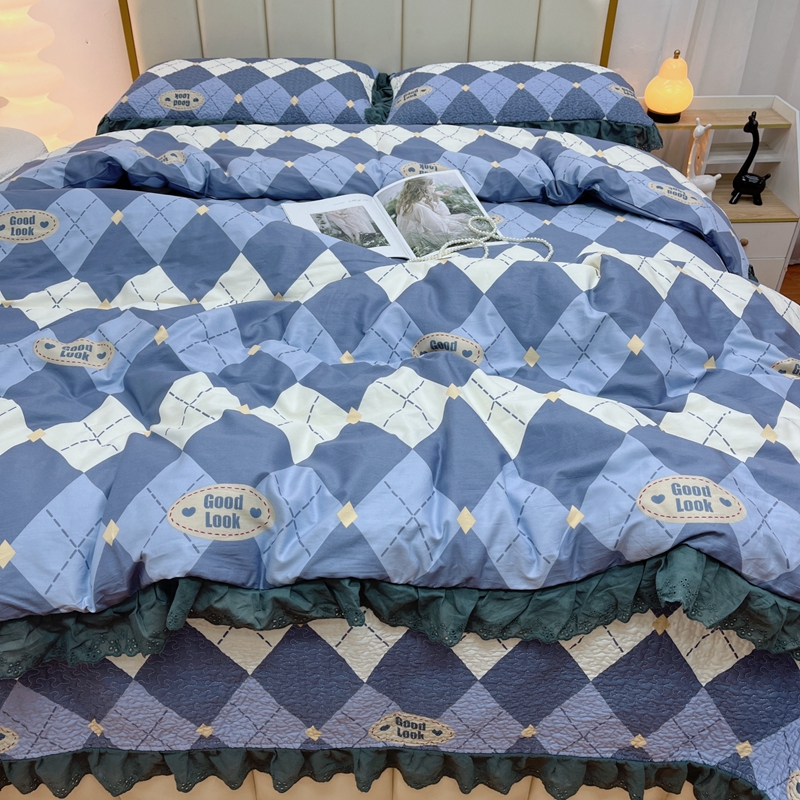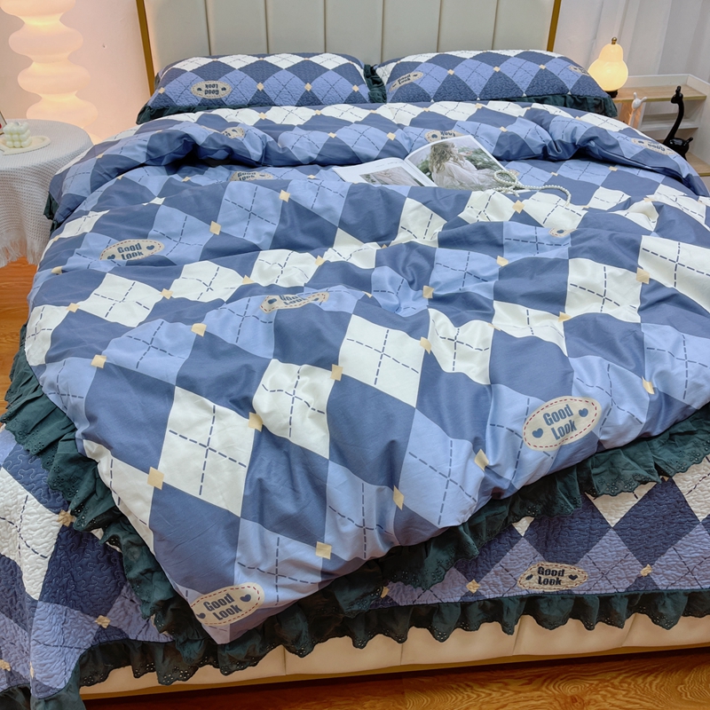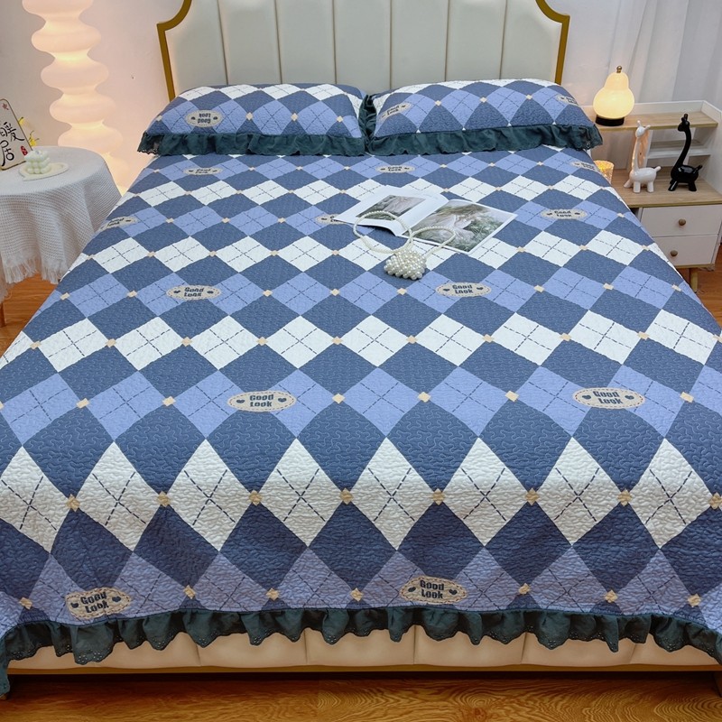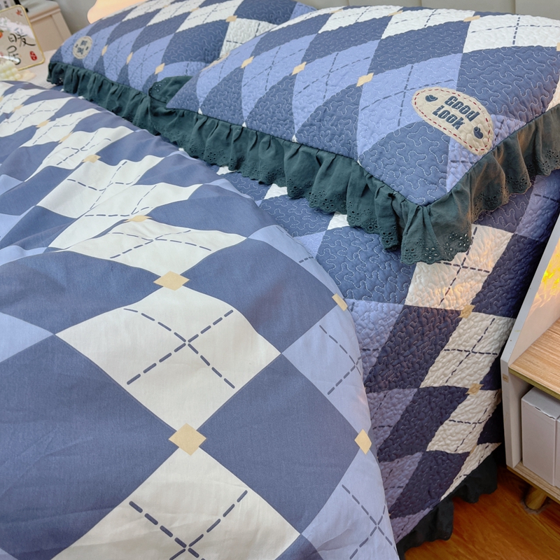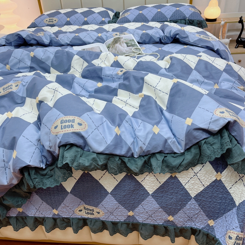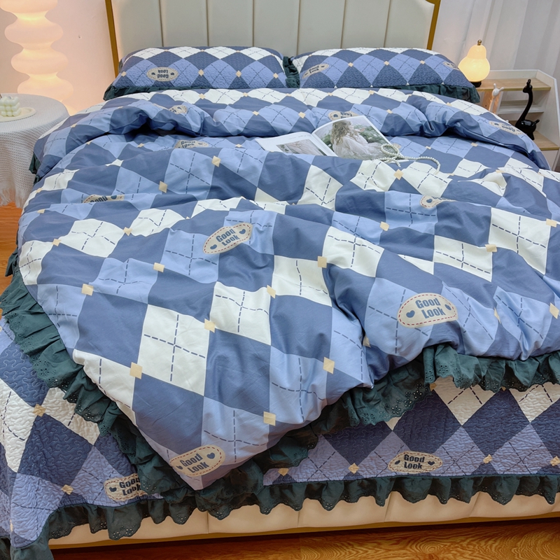 商品名称:暖居 2024新款砂洗棉花被套全棉床盖四件套绗缝夹棉纯棉床盖三件套 菱格蓝