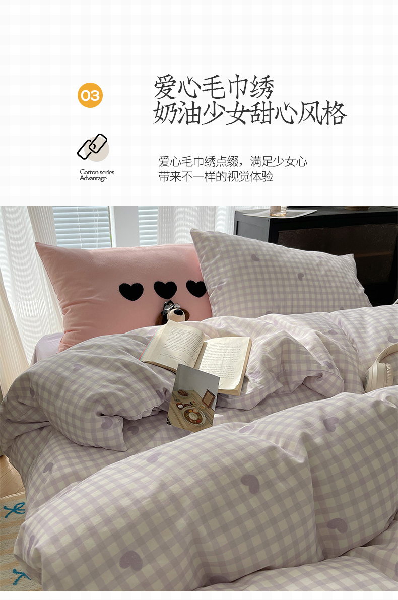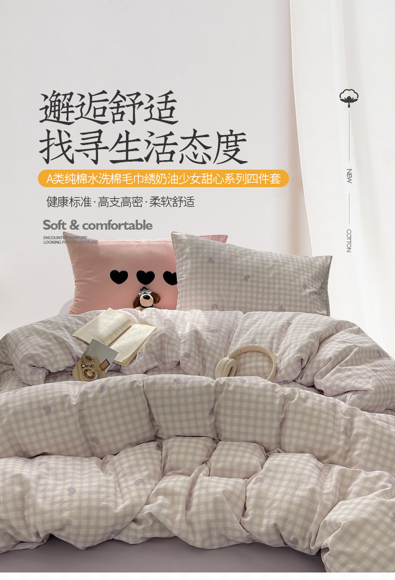 当前位置: 91家纺网 > 商品网购 > 床品套件 > 四件套 > 水洗棉四件套 > 桃子家居 2024新款A类纯棉水洗棉毛巾绣奶油少女甜心系列学生四件套 水洗棉-少女甜心紫紫+紫粉