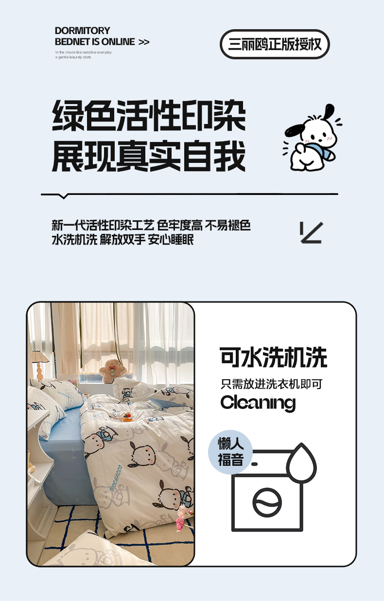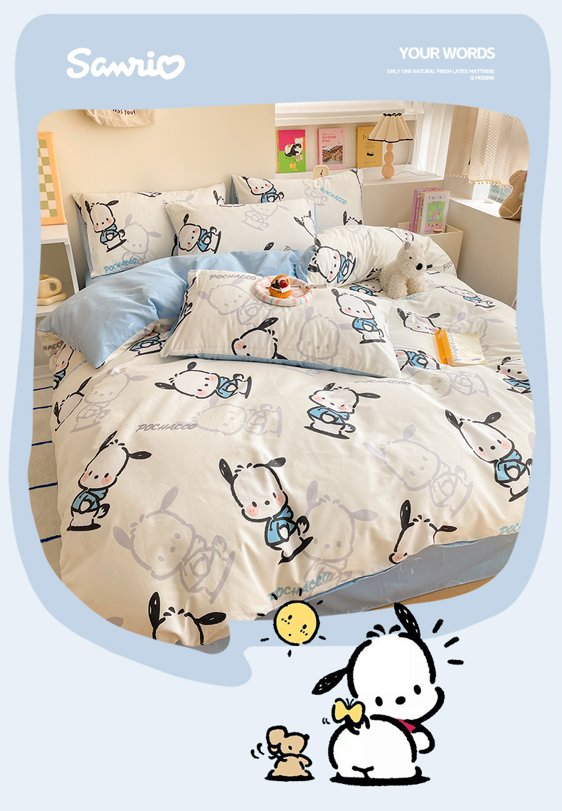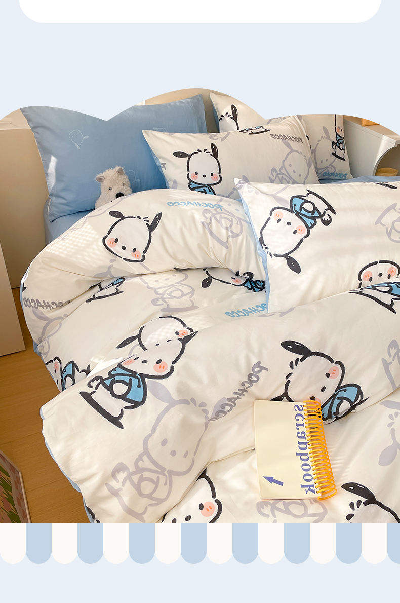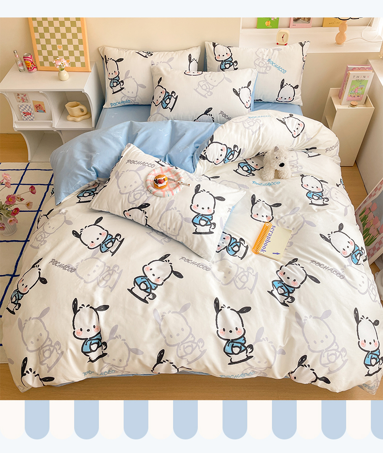 商品名称:雅居纺家纺 2024新款全棉印花13070三丽鸥正版授权四件套 蓝色帕恰狗