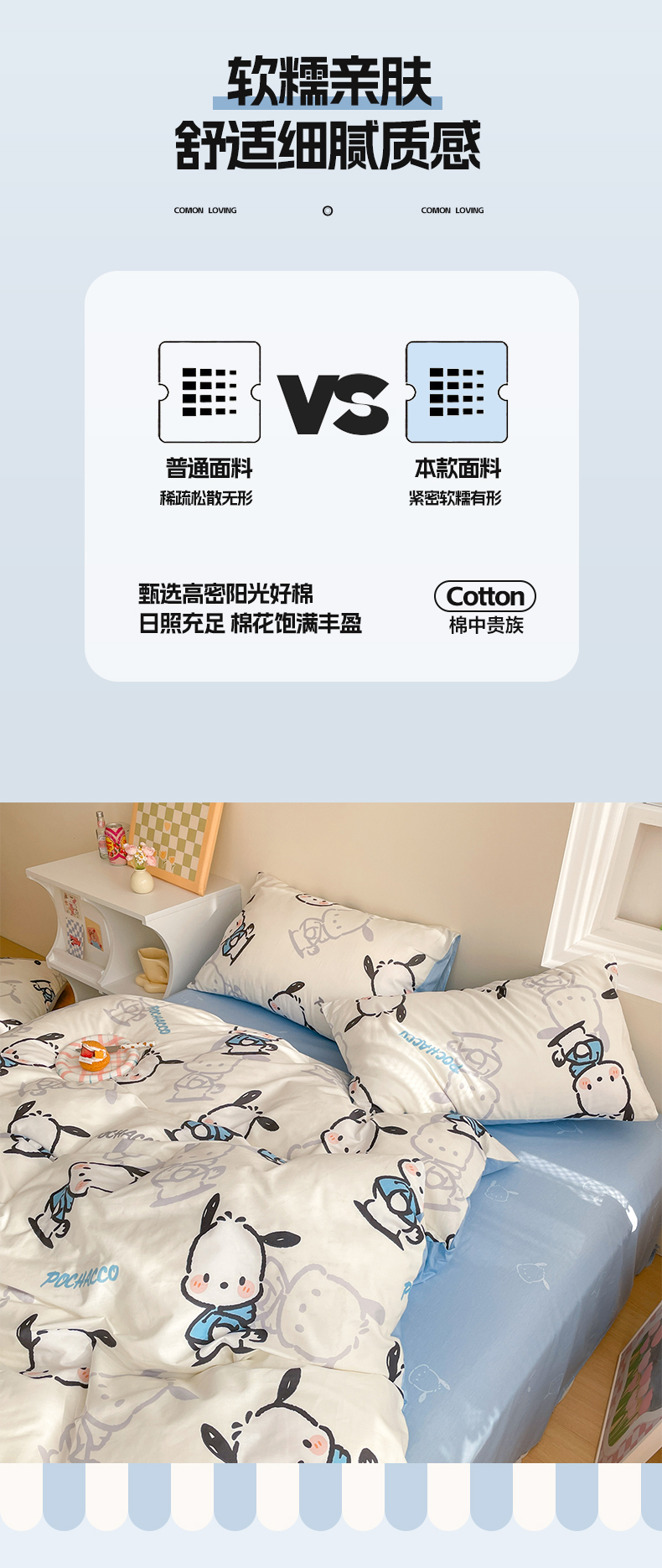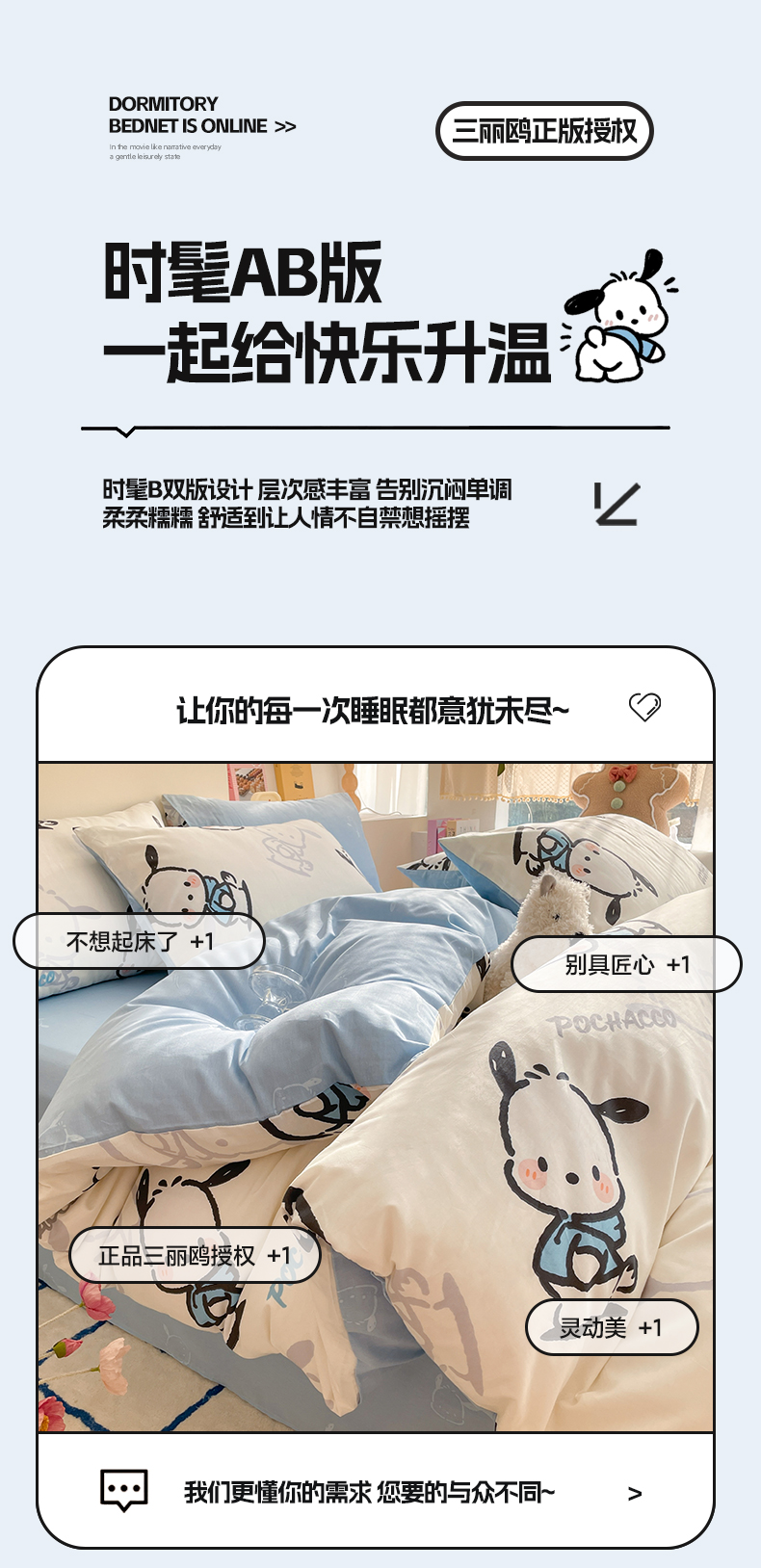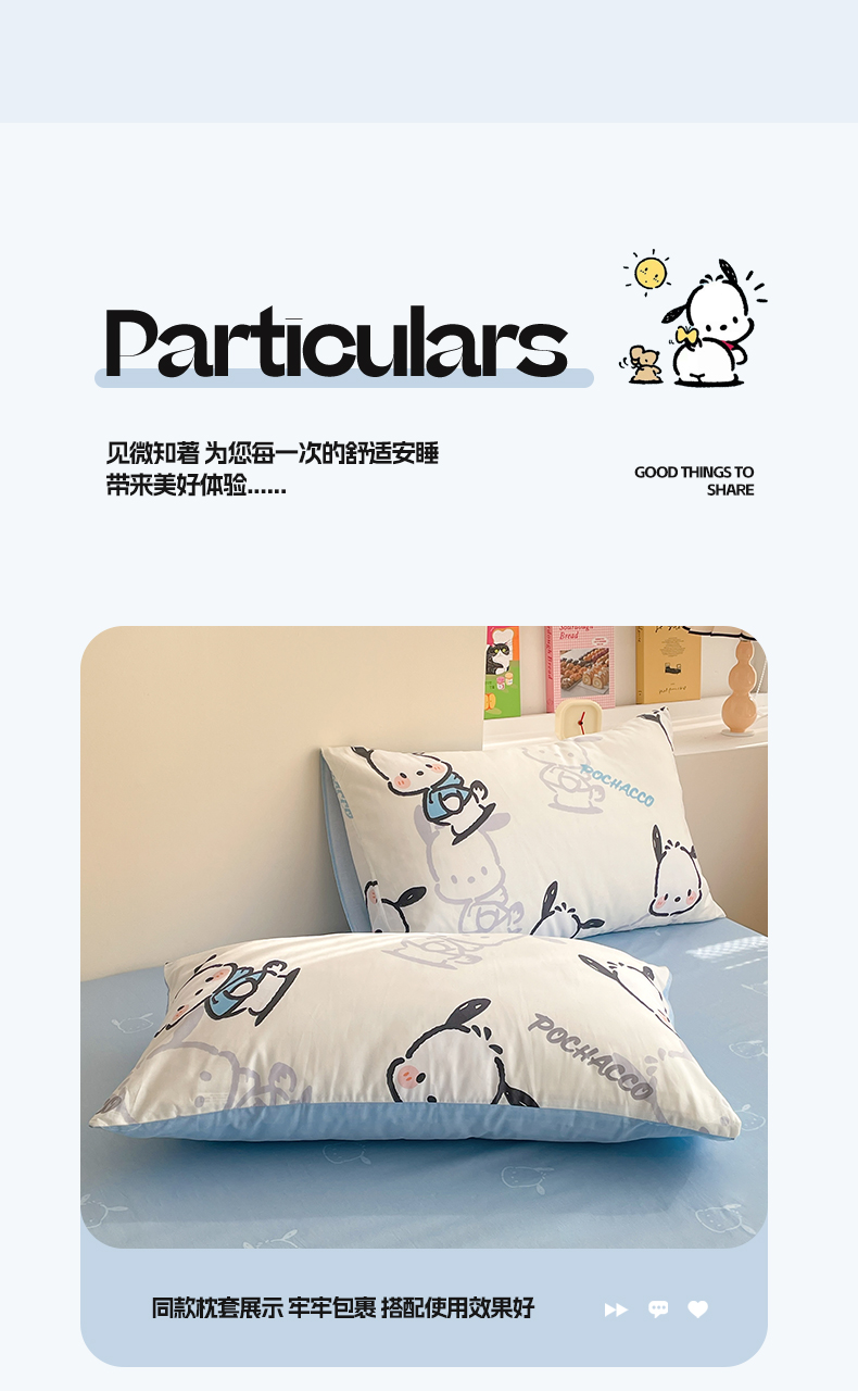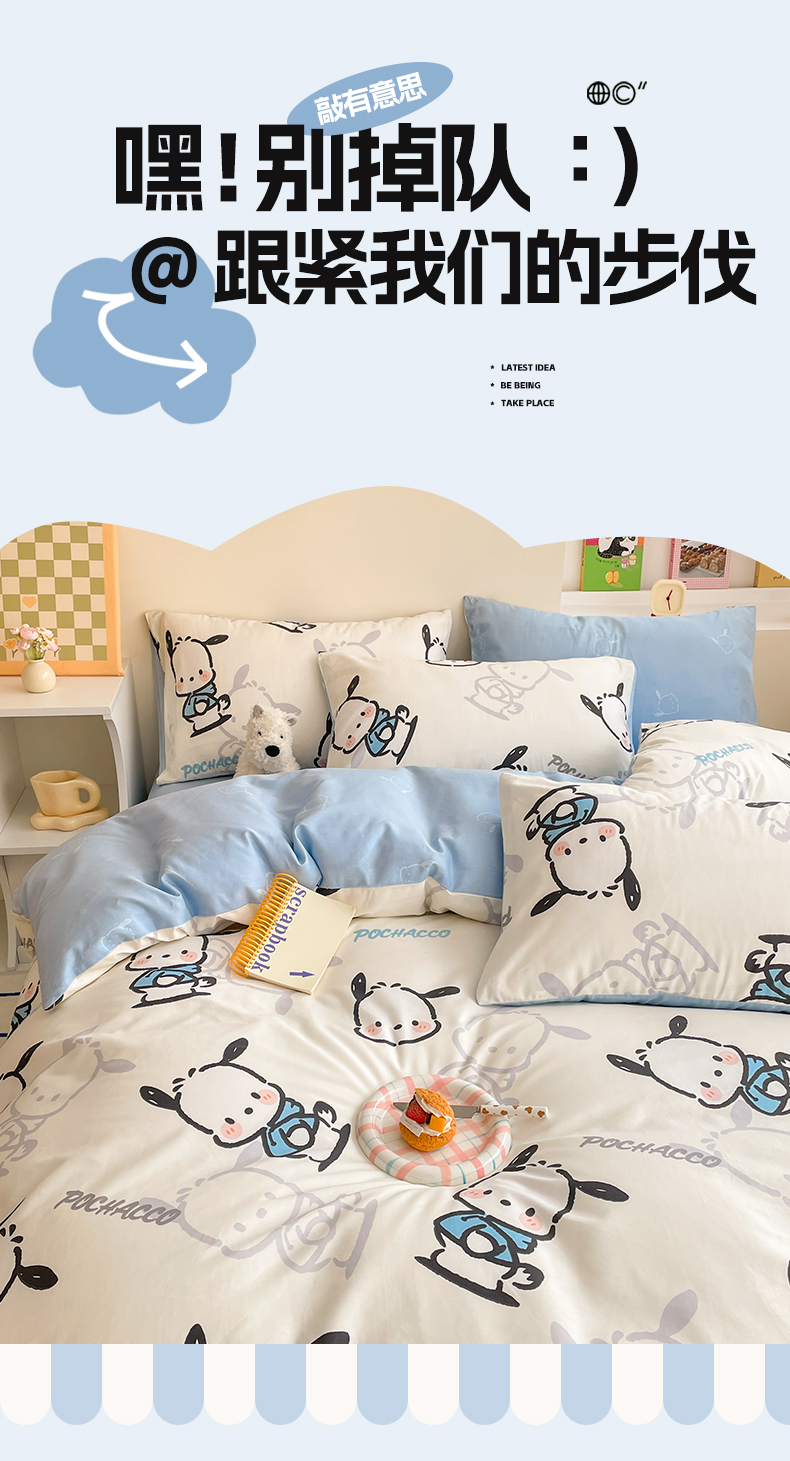 商品名称:雅居纺家纺 2024新款全棉印花13070三丽鸥正版授权四件套 蓝色帕恰狗