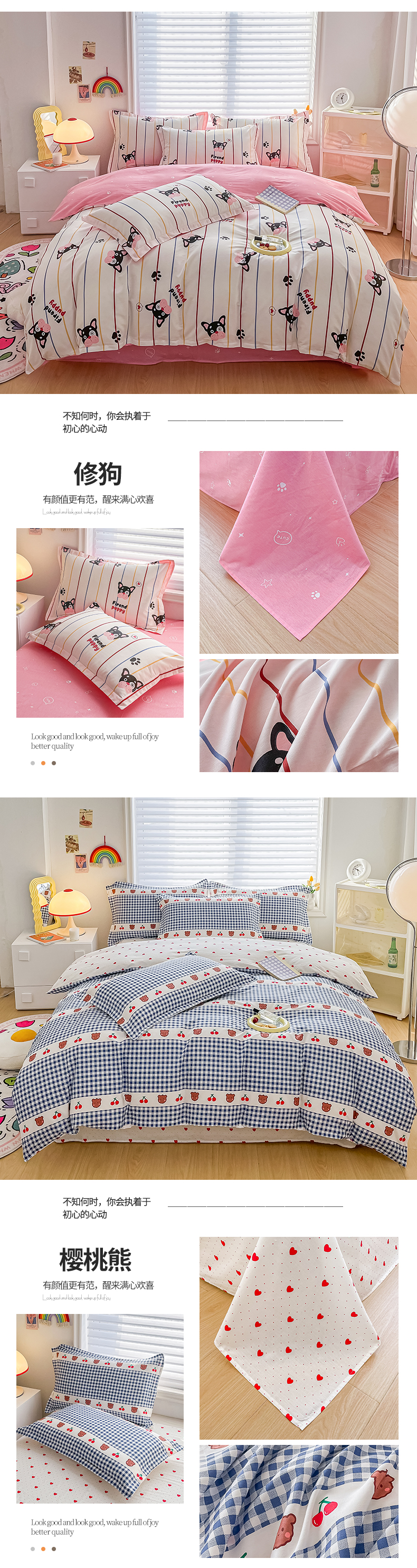 商品名称:慕晨 新款2024开学季13372全棉印花学生三件套小清新卡通花卉ins风四件套直播爆款 修狗