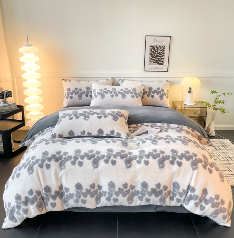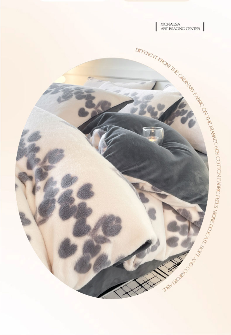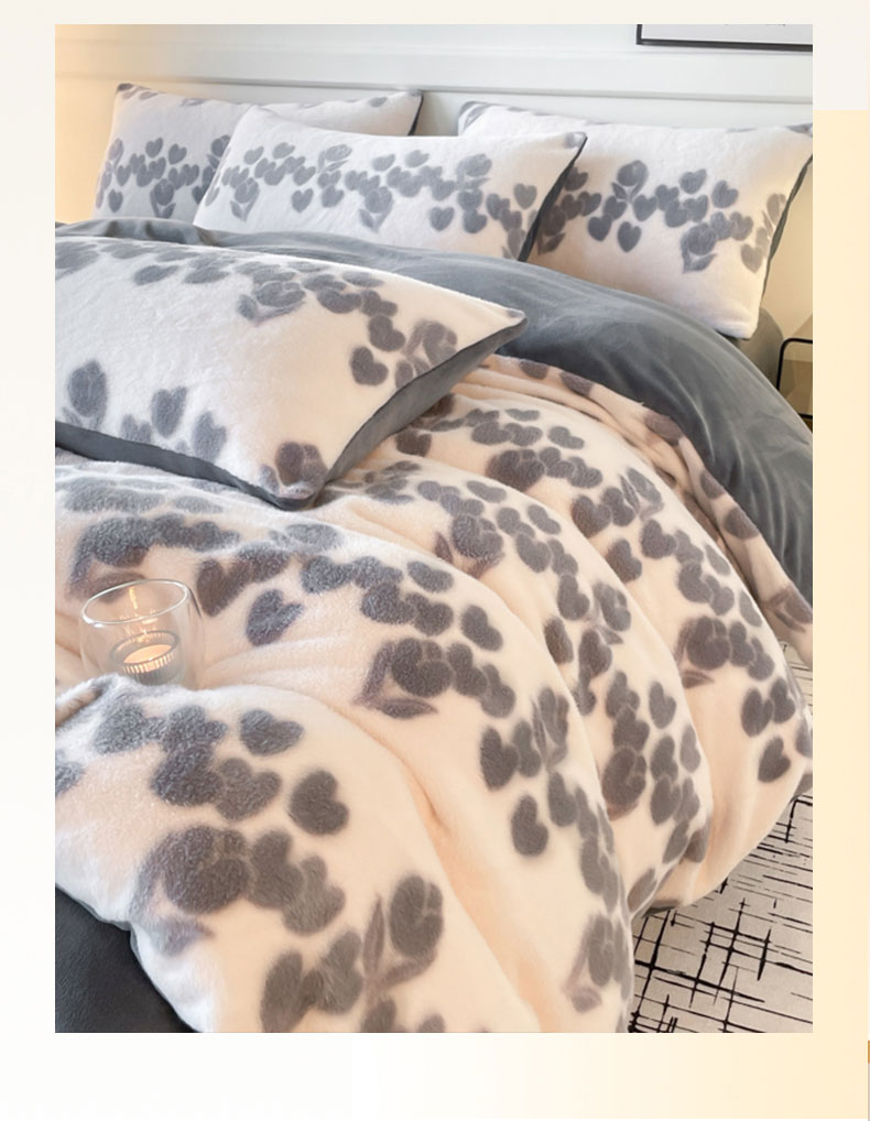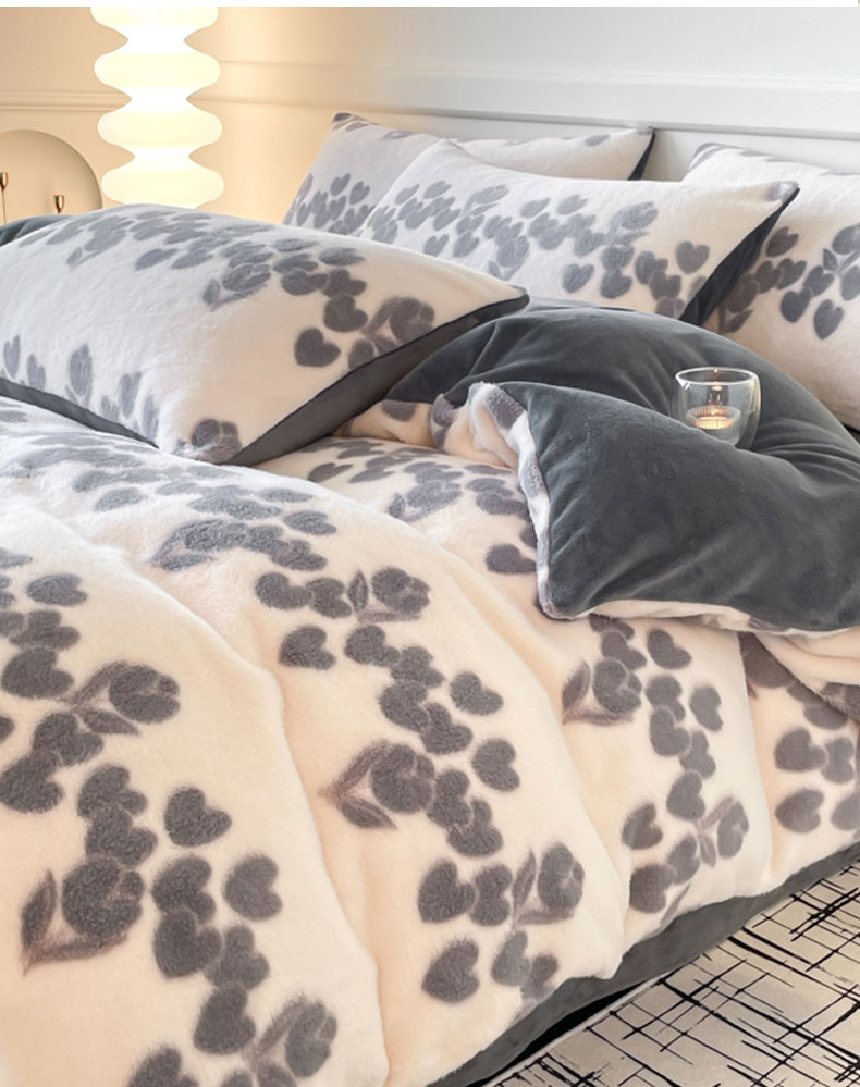 子曰 2024新款兔绒牛奶绒烂花四件套 爱心-灰