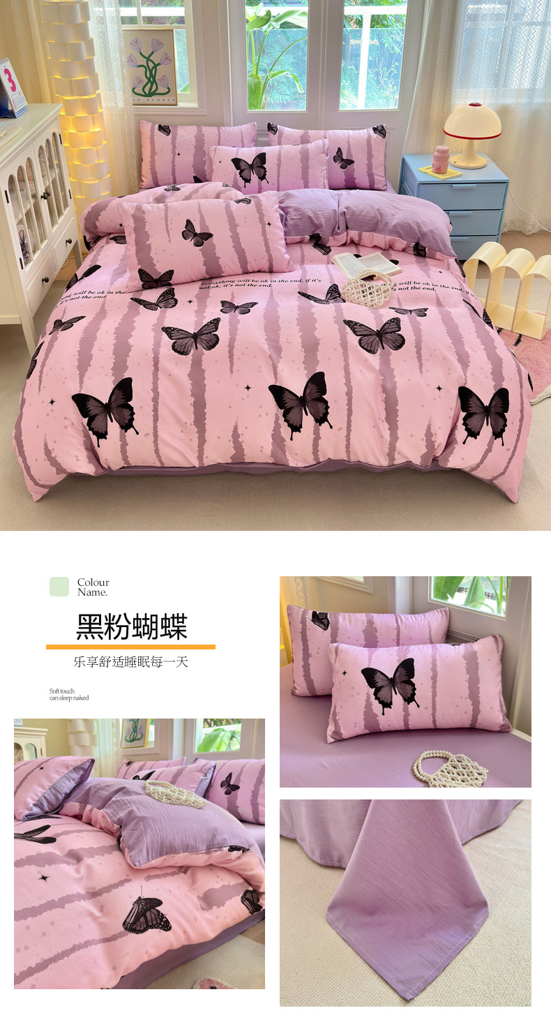 (总)花伞 2024新款印花招财蝴蝶亲肤水洗棉四件套,黑粉蝴蝶,绿蝴蝶,碎花蓝蝴蝶,碎花紫蝴蝶,炫彩蝴蝶,晕染彩蝴蝶