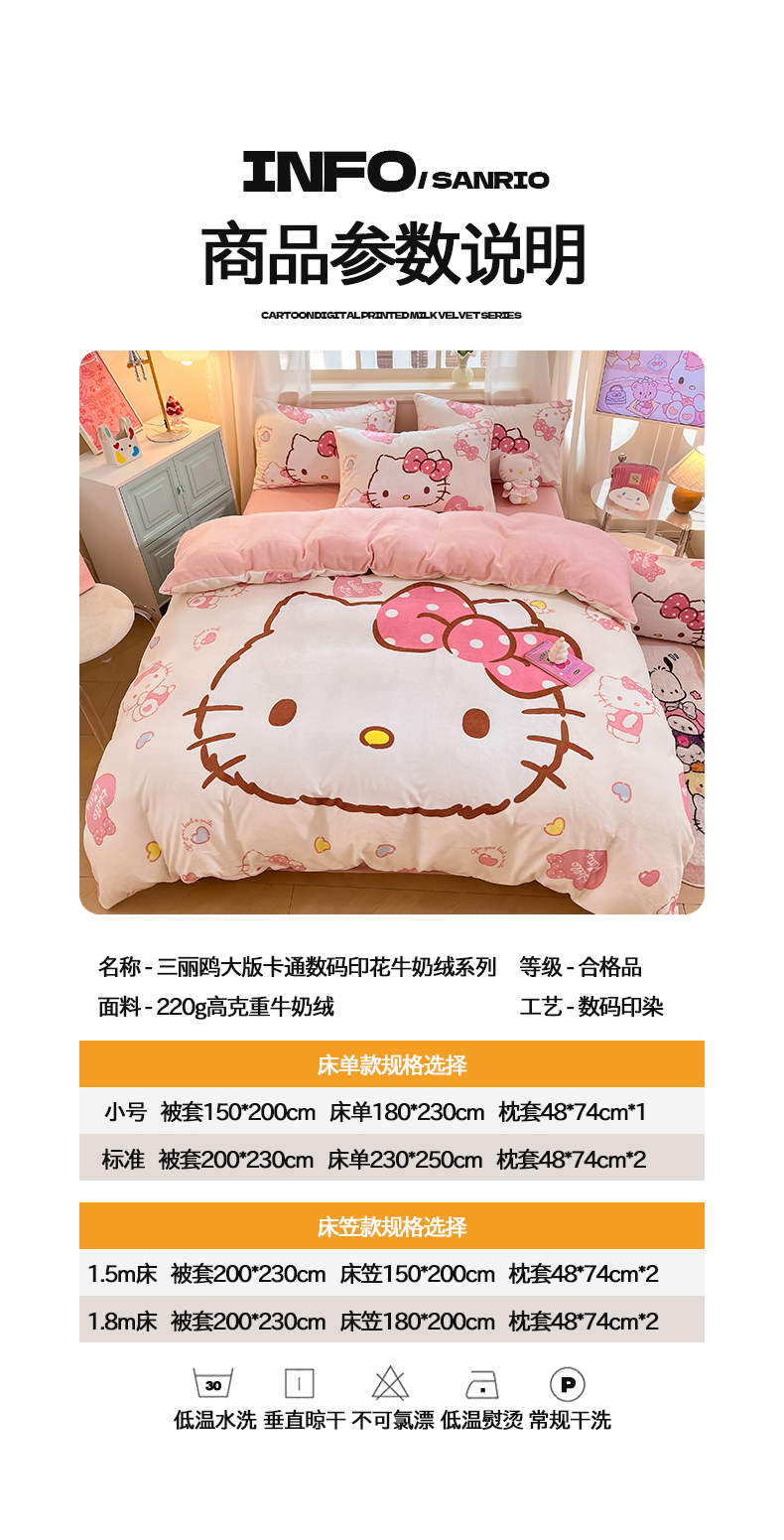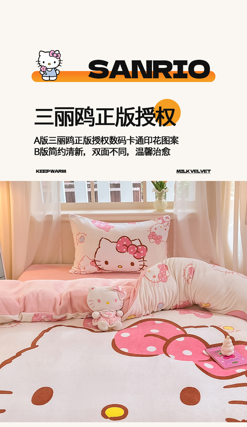 当前位置: 91家纺网 > 商品网购 > 床品套件 > 四件套 > 牛奶绒四件套 > 2024新品正版三丽鸥授权大版卡通平网数码印花加厚高克重牛奶绒系列四件套 绒大版-R甜甜奶油kitty