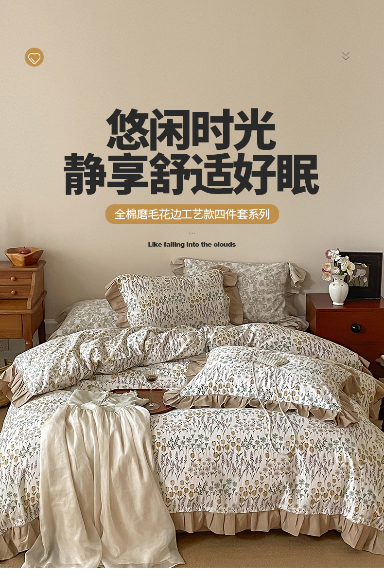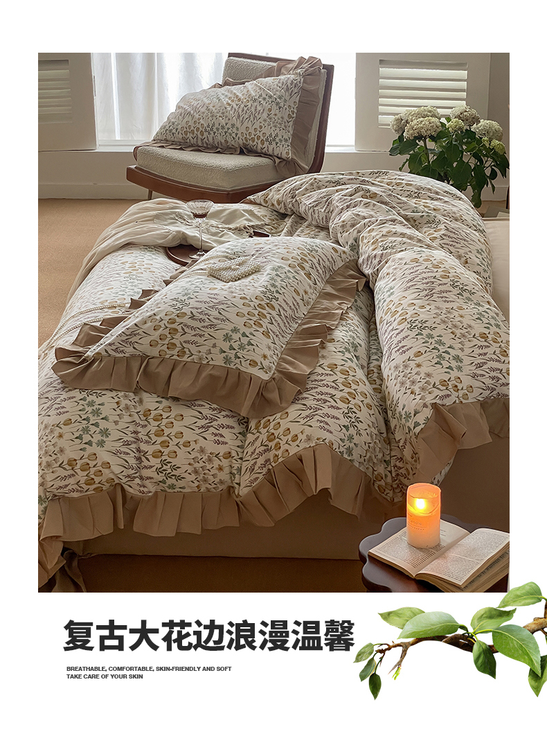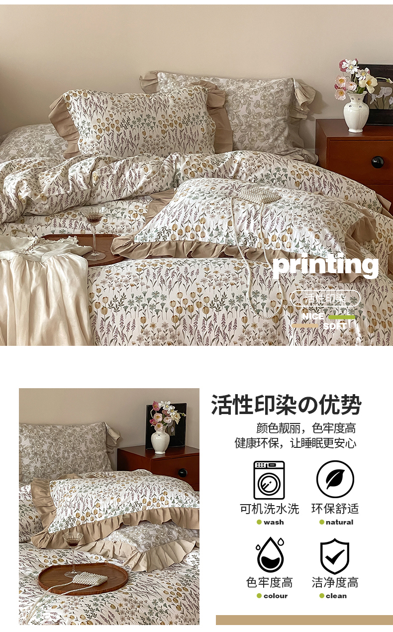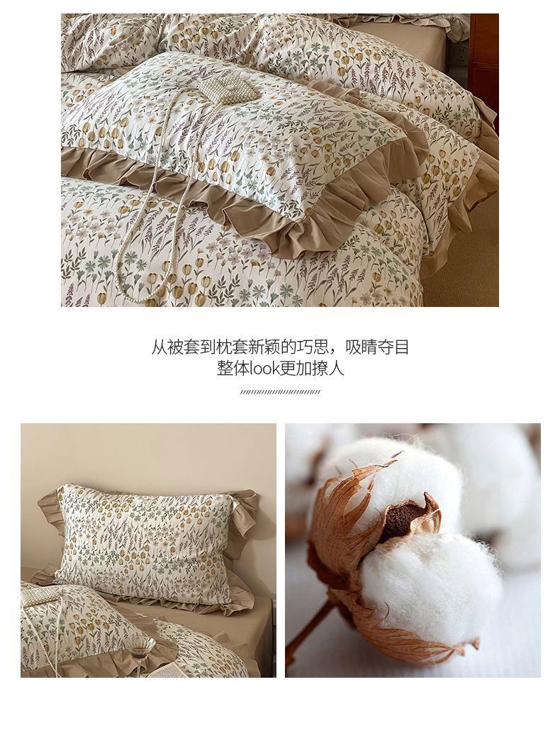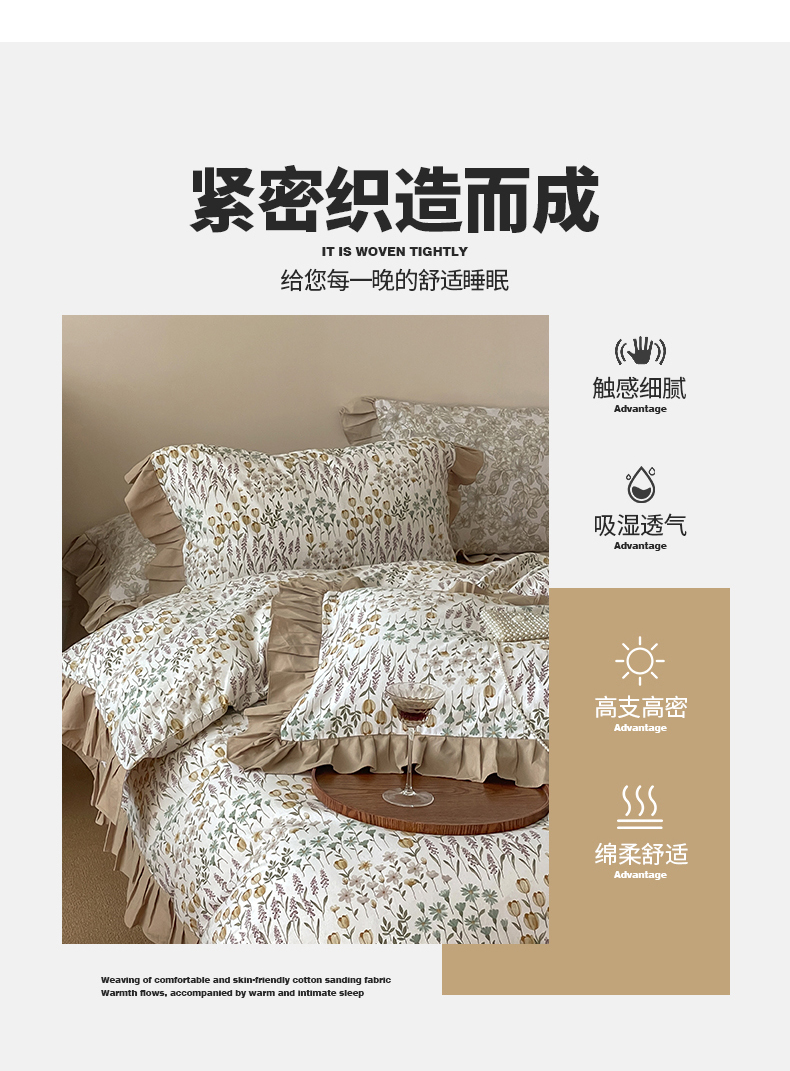 (总)窝米 2025新款数码印花100支长绒棉纯棉工艺花边款四件套-晚意,晚意